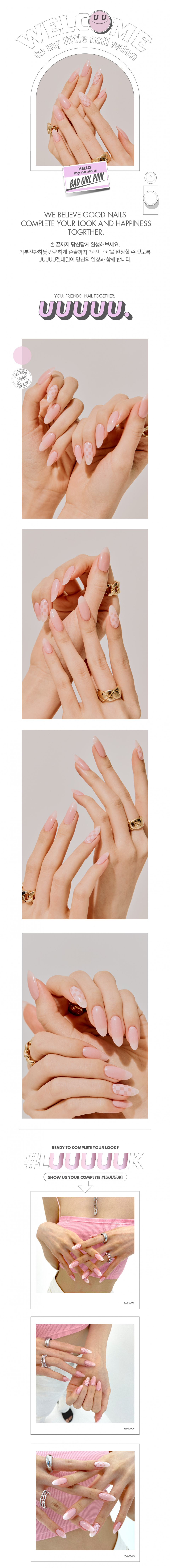 유유유유유(UUUUU.)는 'express U, for U, love U, with U UUUUU.'라는 슬로건 아래, 당신을 위한 쉽고 혁신적이며 감각적인 네일 제품을 선보이는 브랜드입니다.