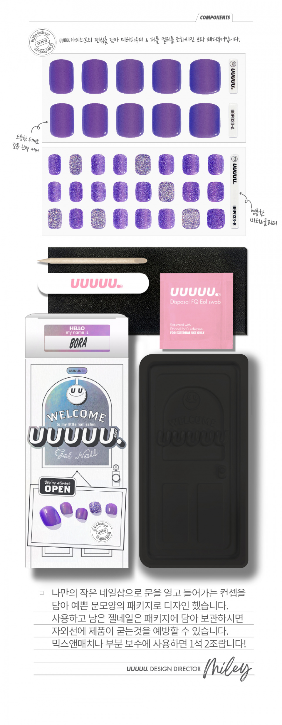 유유유유유(UUUUU.)는 'express U, for U, love U, with U UUUUU.'라는 슬로건 아래, 당신을 위한 쉽고 혁신적이며 감각적인 네일 제품을 선보이는 브랜드입니다.