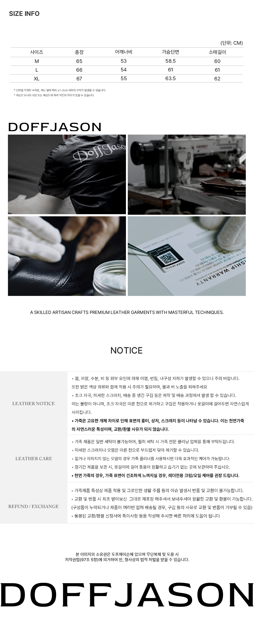 도프제이슨(DOFFJASON)은 가죽이라는 소재에 대한 이해를 기반으로 레더 가먼츠를 중심으로 디자인하는 브랜드입니다. 스타일에 구애받지 않고 오래 입을수록 가치를 더하는 타임리스 디자인을 추구하고, 절제된 디테일과 뛰어난 퀄리티의 아이템을 선보입니다.