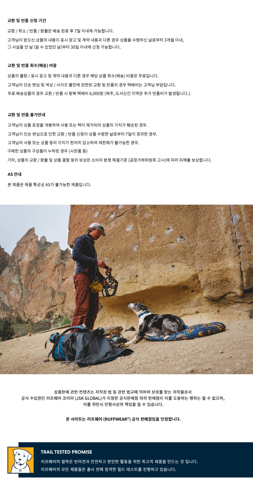 러프웨어(RUFFWEAR)는 그 이름만으로도 애견용품을 대표하는 최고급 브랜드로 미국 오리건주 밴드에 위치했습니다. 러프웨어의 철학은 개와 사람이 동료애를 느끼며 아웃도어 활동을 안전하고 편안하게 할 수 있는 최고급 아웃도어 애견용품을 만드는 것이며, 이를 위해 제품의 디자인, 소재를 그 목적에 맞게 설계/제작하고 있으며 지속적인 제품 개발을 통해 최고의 애견용품 업체로의 위상을 굳건해 하고 있습니다.