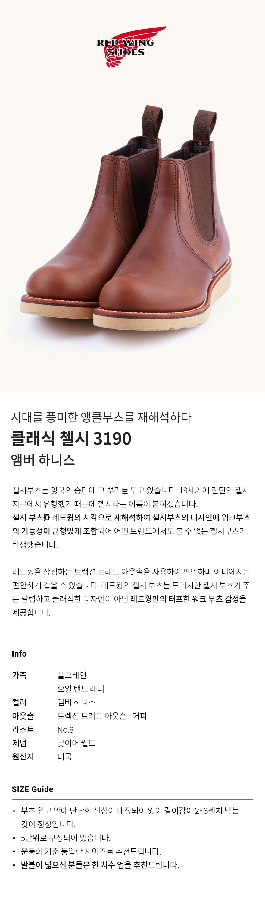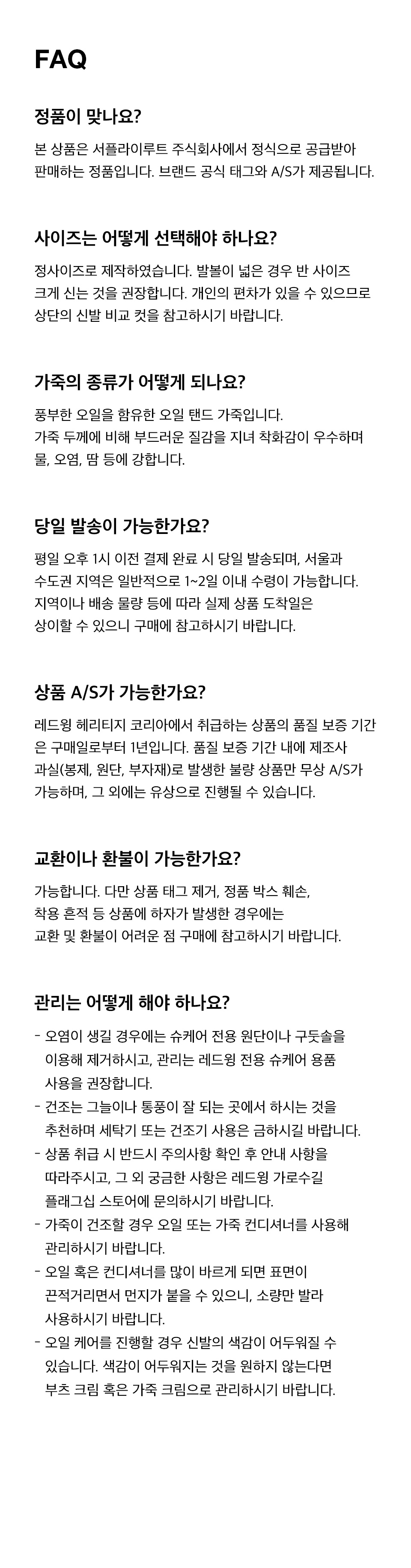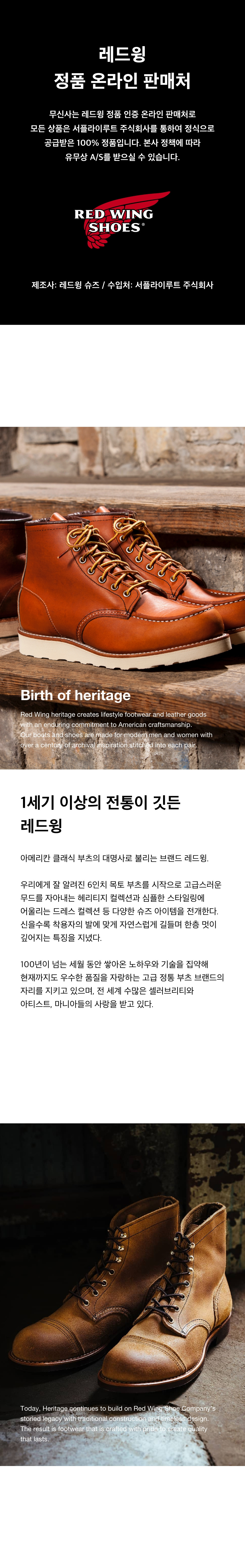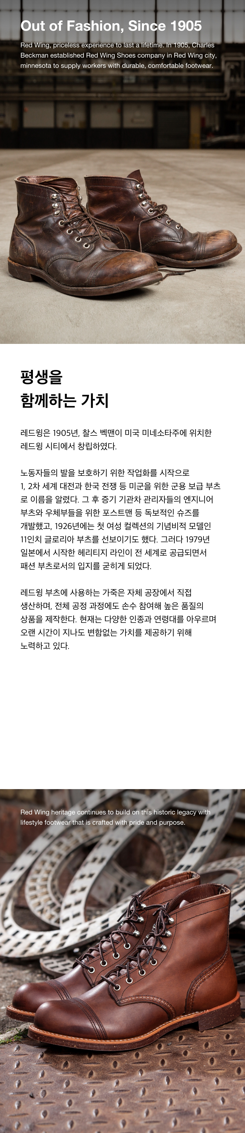 레드윙(RED WING)은 1905년 미국 미네소타에서 시작된 워크 부츠 브랜드로, 자체 테너리에서 생산한 풀그레인 가죽과 굿이어 웰트 공법을 통해 뛰어난 내구성과 장인 정신을 담아냅니다. 착용자의 삶과 이야기, 다음 세대까지 이어질 가치를 제공하는 브랜드입니다.