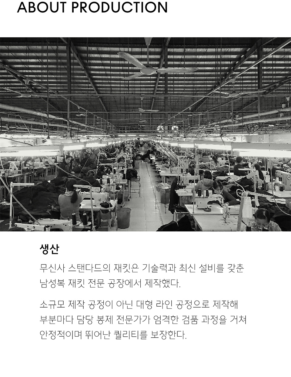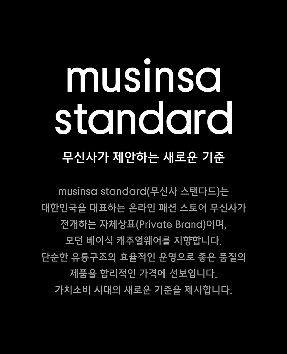 무신사 스탠다드(MUSINSA STANDARD)는 대한민국을 대표하는 온라인 패션 스토어 무신사가 전개하는 자체상표(Private Brand)이며, 모던 베이식 캐주얼웨어를 지향합니다. 단순한 유통구조의 효율적인 운영으로 좋은 품질의 제품을 합리적인 가격에 선보입니다. 가치소비 시대의 새로운 기준을 제시합니다.