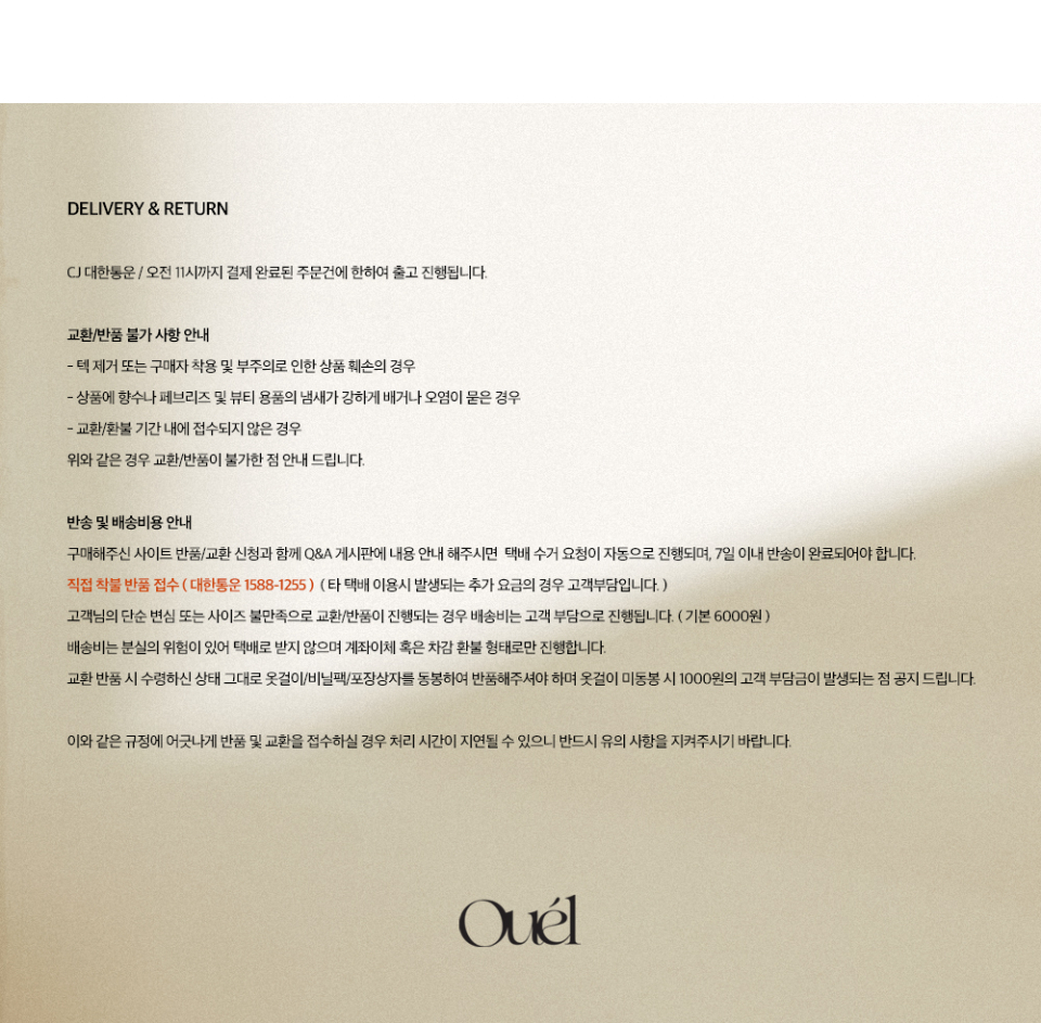 OUEL(오앨)은 빈티지 로맨틱 무드를 모던한 감각으로 재해석하여 풀어낸 브랜드입니다.