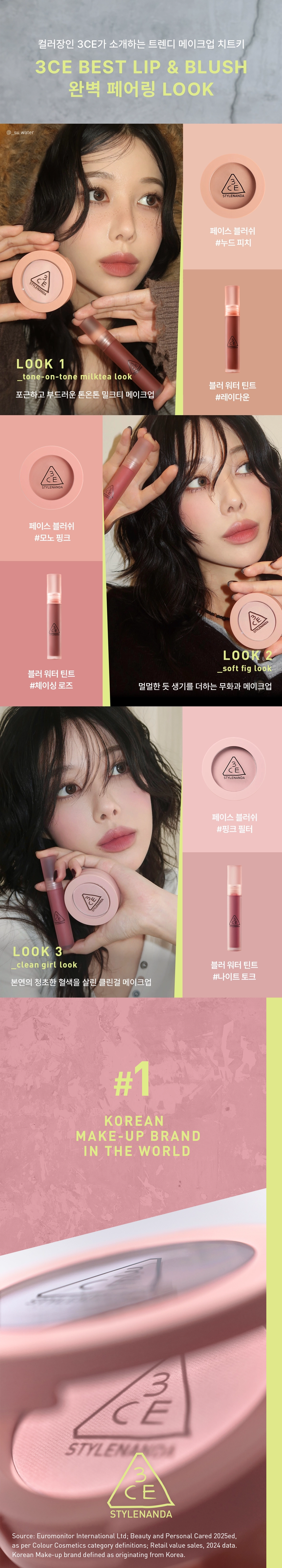 쓰리씨이(3CE)는 3가지 매력적인 시선으로 패셔너블한 여성을 빛나게 만들어 주는 브랜드입니다. 3CE와 함께라면 누구나 모던한 컬러의 다양한 스펙트럼으로, 크리에이티브하고 차별화된 느낌의 메이크오버를 경험할 수 있습니다.