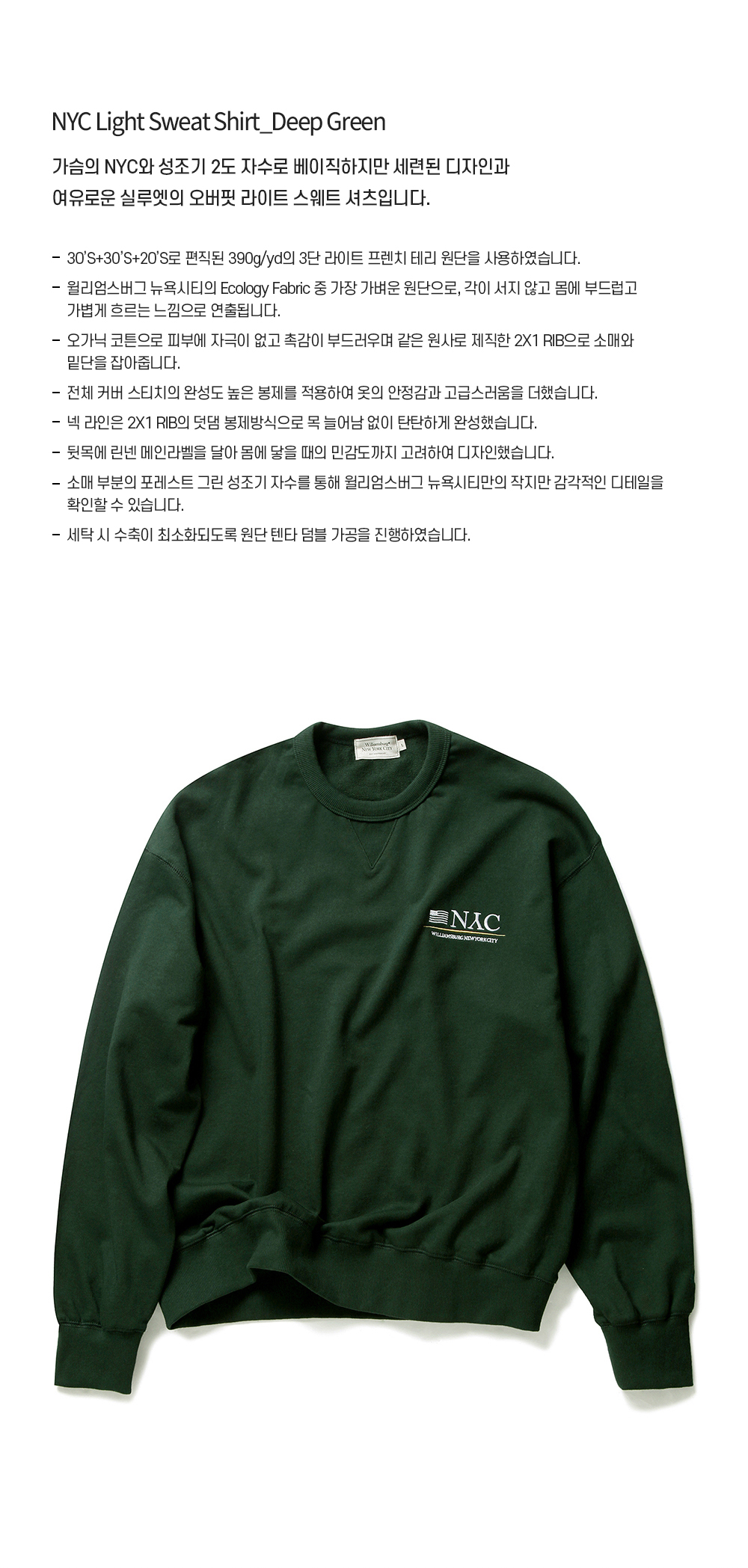 윌리엄스버그 뉴욕시티(WILLIAMSBURG NEWYORK CITY)는 사람과 일상에서 얻을 수 있는 모든 진정성과 가치로부터 영감을 얻는 캐주얼 시티 웨어 브랜드입니다.