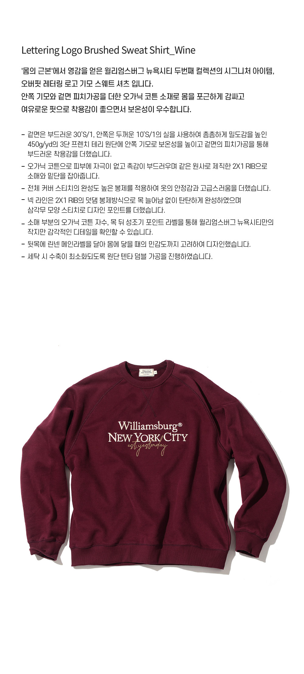 윌리엄스버그 뉴욕시티(WILLIAMSBURG NEWYORK CITY)는 사람과 일상에서 얻을 수 있는 모든 진정성과 가치로부터 영감을 얻는 캐주얼 시티 웨어 브랜드입니다.