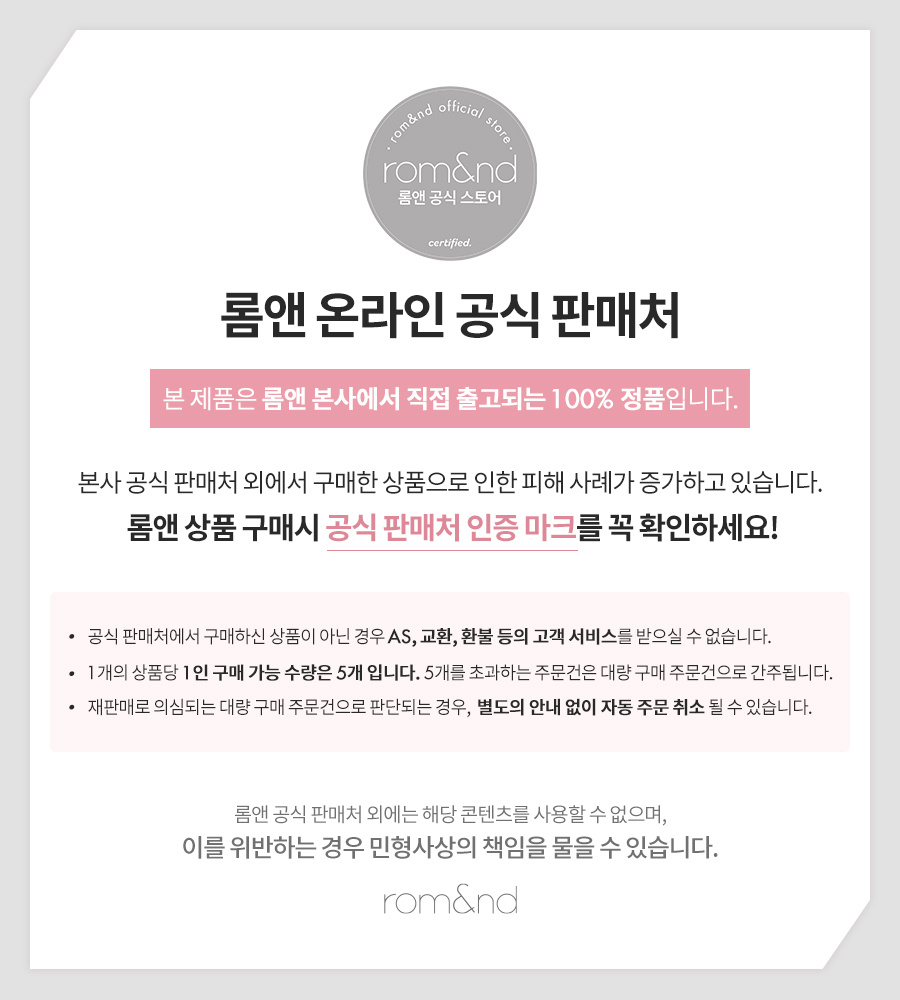 롬앤(ROM&ND)은 화장품에 푹 빠지는 즐거움을 전합니다. 코덕(코스메틱 덕후)들의 감각과 취향을 다채로운 컬러와 스토리로, 일상 속 설렘과 몰입의 경험을 선사하는 색조 전문 브랜드입니다.