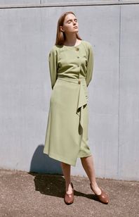 겹트임과 주름 디테일로 걸을때 자연스럽게 포인트가 되며 웨이스트라인에 우드버튼 디테일을 더했습니다.