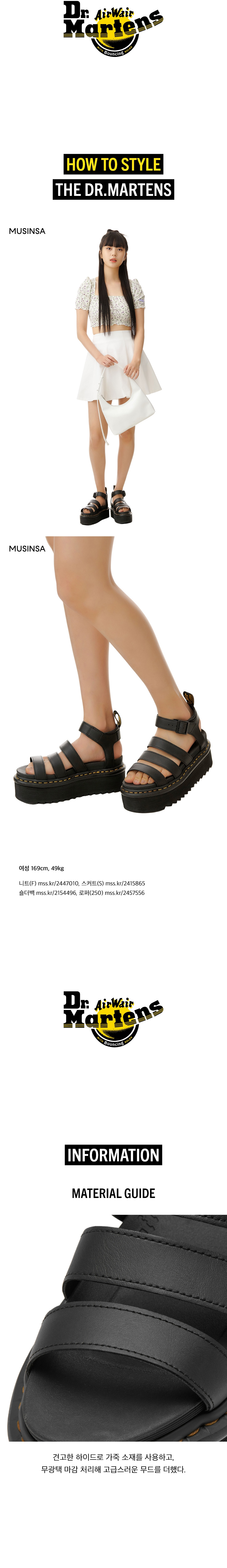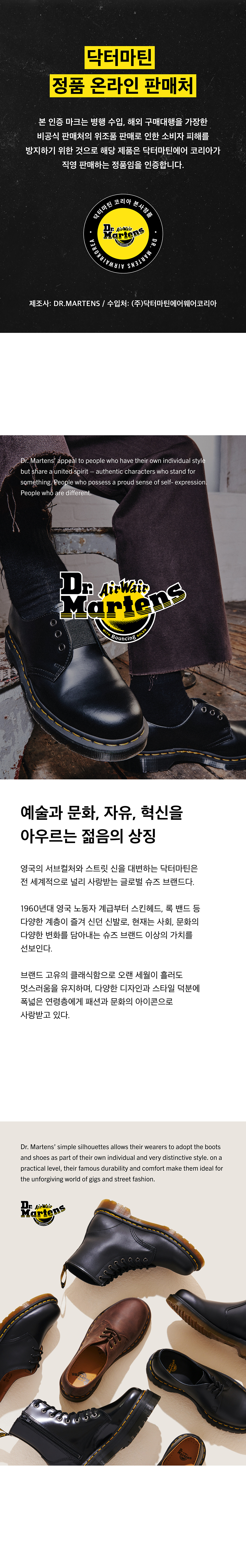 닥터마틴(DR.MARTENS)은 군인의 발을 편하게 만들기 위해 시작했지만 지금은 뮤지션, 패션피플, 모델 등의 사랑을 받는 상징적인 부츠 아이템으로 성장하며 한국뿐 아니라 전 세계에서 사랑을 받는 영국 브랜드로 자리매김을 했습니다. 편안한 착화감과 함께 다양한 스타일을 자랑하며, 신을 수록 자신의 개성과 스타일을 연출할 수 있게 돕는 독특한 매력도 함께 지니고 있습니다.