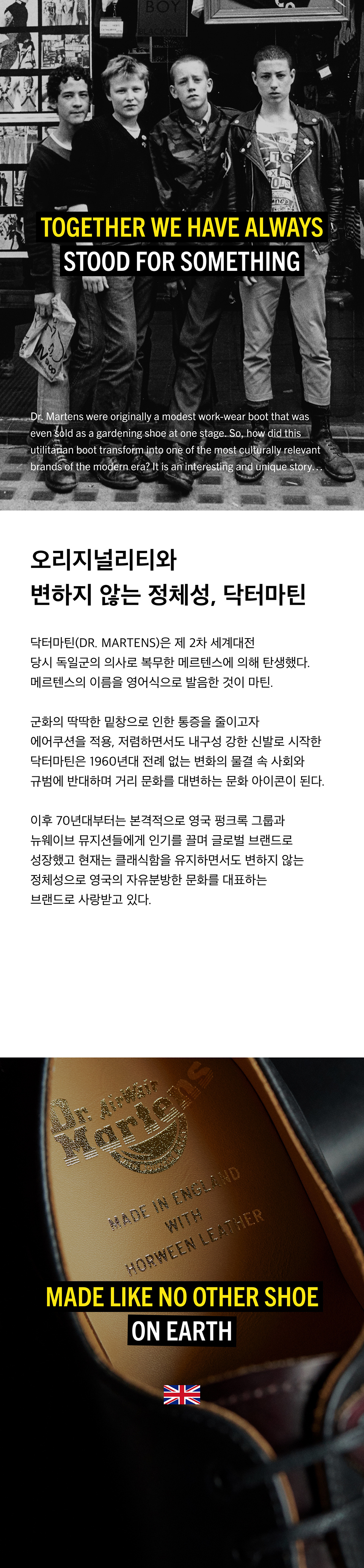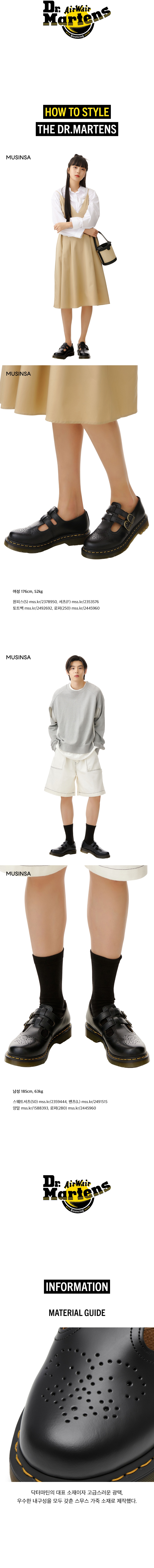 닥터마틴(DR.MARTENS)은 군인의 발을 편하게 만들기 위해 시작했지만 지금은 뮤지션, 패션피플, 모델 등의 사랑을 받는 상징적인 부츠 아이템으로 성장하며 한국뿐 아니라 전 세계에서 사랑을 받는 영국 브랜드로 자리매김을 했습니다. 편안한 착화감과 함께 다양한 스타일을 자랑하며, 신을 수록 자신의 개성과 스타일을 연출할 수 있게 돕는 독특한 매력도 함께 지니고 있습니다.