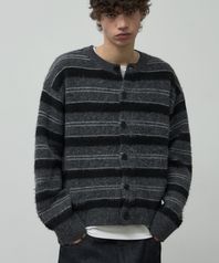 헤어리 스트라이프 크롭 니트 가디건 [딥그레이]