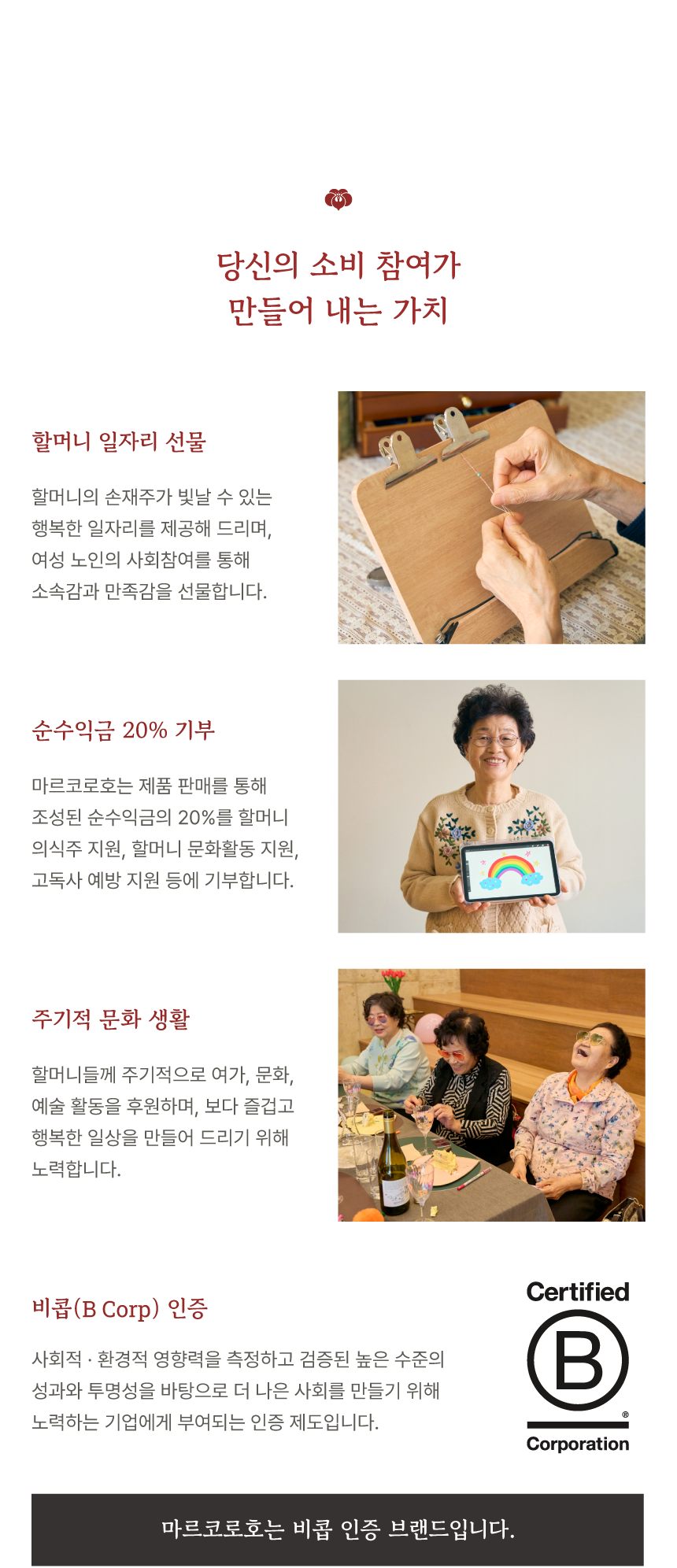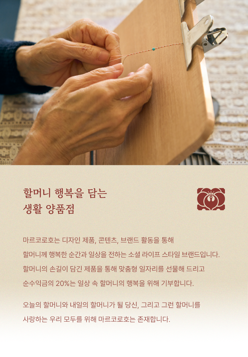 마르코로호(MARCO ROHO)는 할머니들의 일상을 행복하게 만들어주는 브랜드입니다.