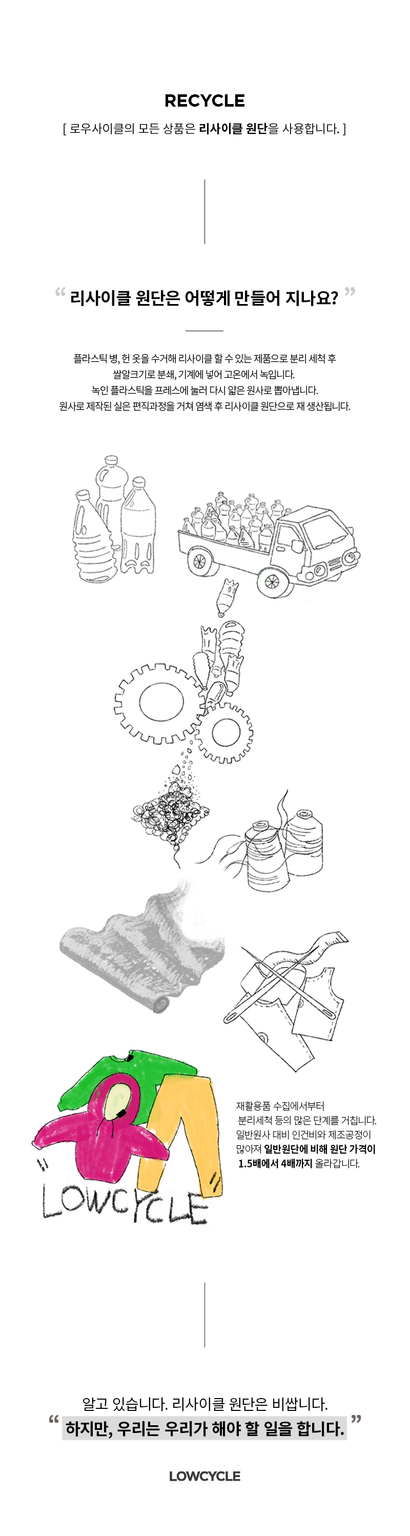 로우사이클(LOWCYCLE)은 환경을 생각하고 작은 것부터 실천하는 친환경 원 마일 웨어 브랜드입니다. 모든 제품을 리사이클 재료를 사용하여 제작합니다.