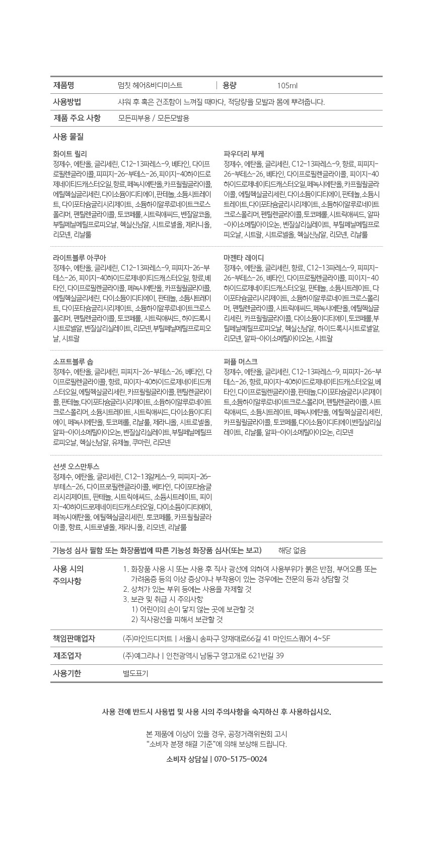[SET] 헤어앤바디미스트 105ml 7종(택2)