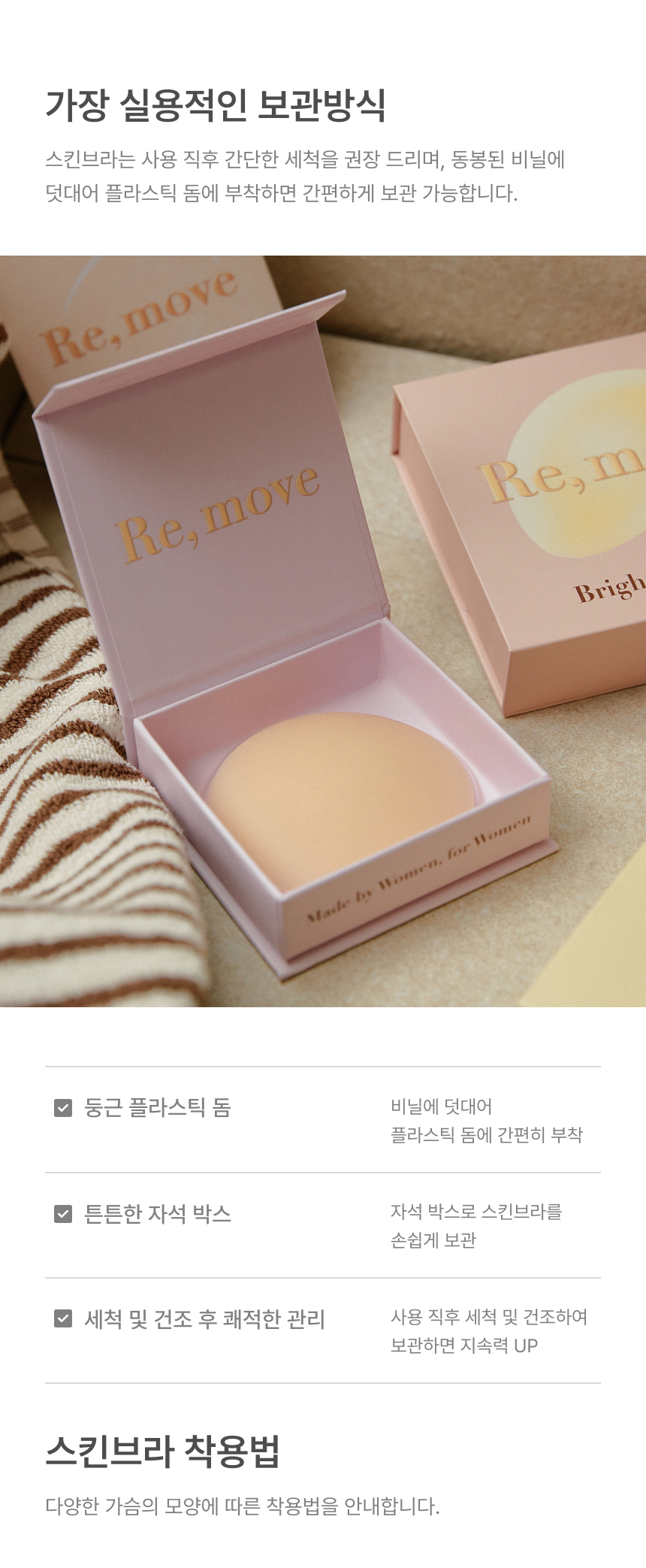 리무브(REMOVE)는 속옷을 넘어 여성의 일상과 일생에 다양한 선택권을 만들어가는 브랜드입니다. 온전히 브래지어를 하지 않는 것, 아직 여성들에게 용기가 필요한 일입니다. 용기를 내지 않아도 자연스러운 것이 될 수 있도록 리무브는 과도기 속 대안품을 만들어 나갑니다.