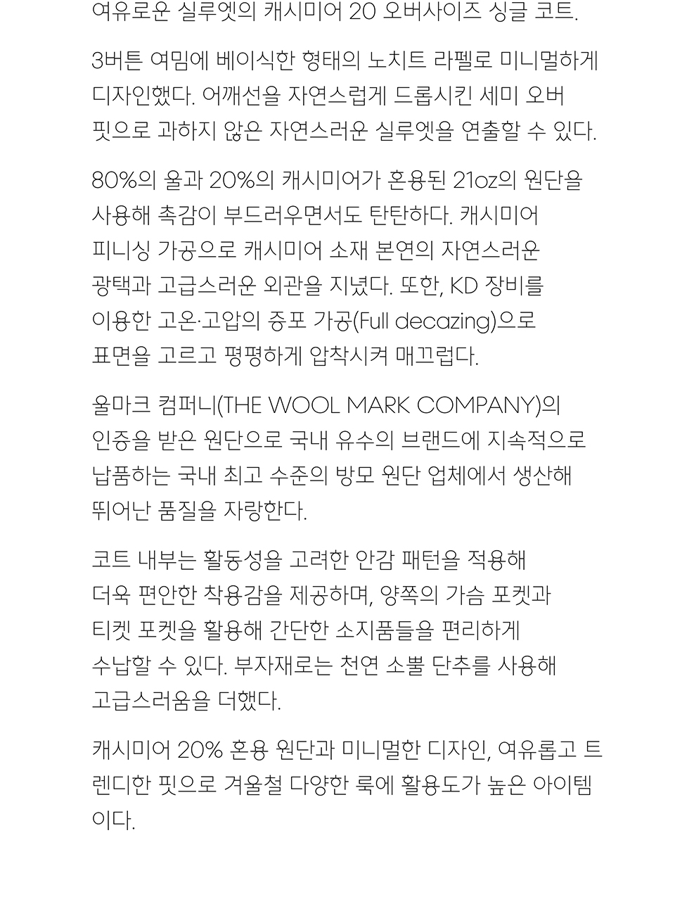 캐시미어 20 오버사이즈 싱글 코트 [차콜 그레이]
