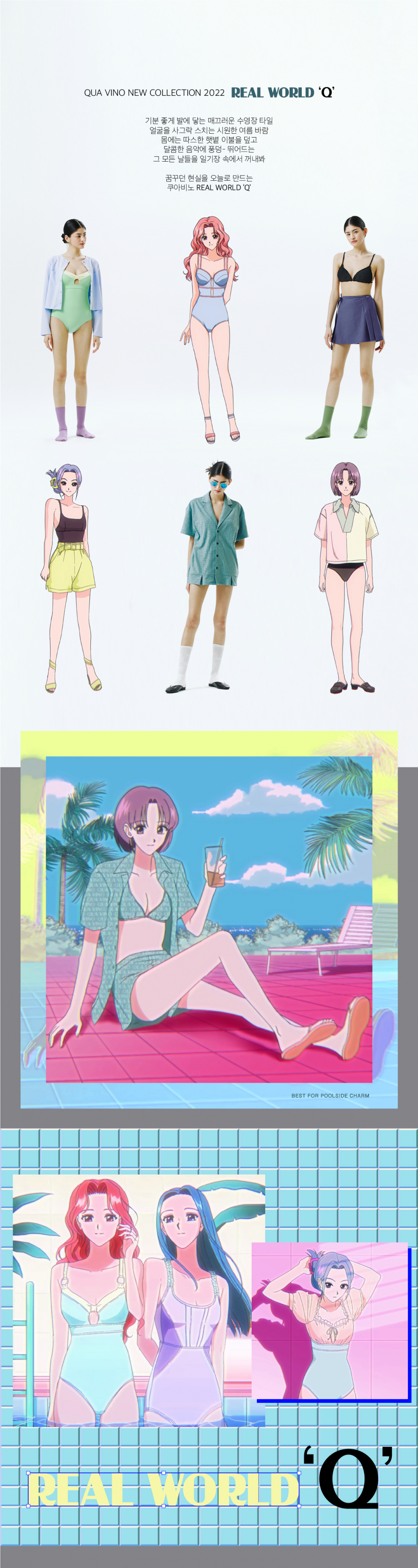 QUA VINO(쿠아비노)는 물을 뜻하는 QUA, 와인을 뜻하는 VINO. 풀사이드에서 마시는 시원한 스파클링 와인처럼 여유롭고 행복한 휴식을 뜻합니다. 풀사이드의 긍정적 활기가 가져다주는 즐거움과 행복을 전달하기 위해 기획된 토털 풀사이드 스타일을 제안하는 브랜드입니다.