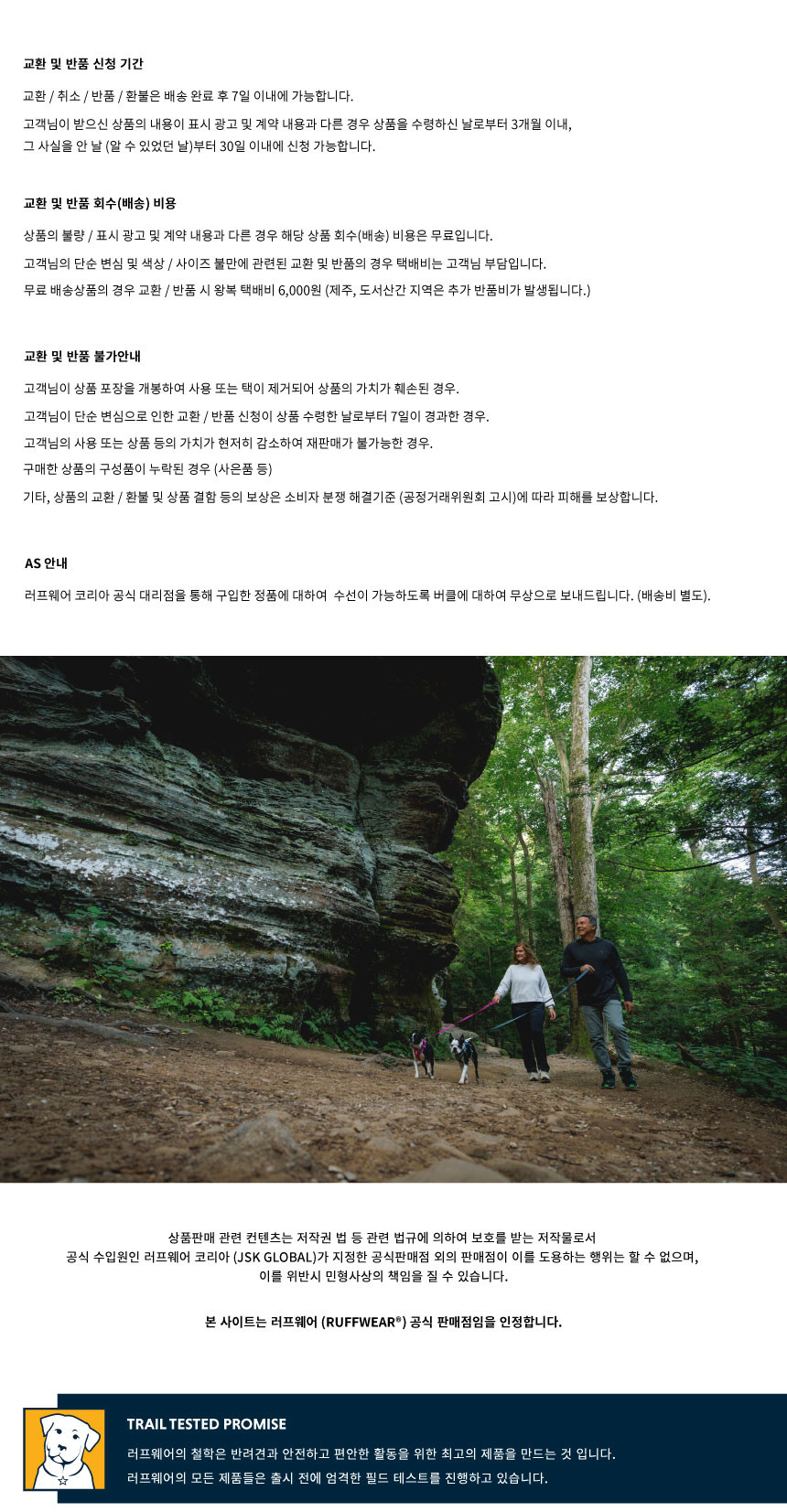러프웨어(RUFFWEAR)는 그 이름만으로도 애견용품을 대표하는 최고급 브랜드로 미국 오리건주 밴드에 위치했습니다. 러프웨어의 철학은 개와 사람이 동료애를 느끼며 아웃도어 활동을 안전하고 편안하게 할 수 있는 최고급 아웃도어 애견용품을 만드는 것이며, 이를 위해 제품의 디자인, 소재를 그 목적에 맞게 설계/제작하고 있으며 지속적인 제품 개발을 통해 최고의 애견용품 업체로의 위상을 굳건해 하고 있습니다.