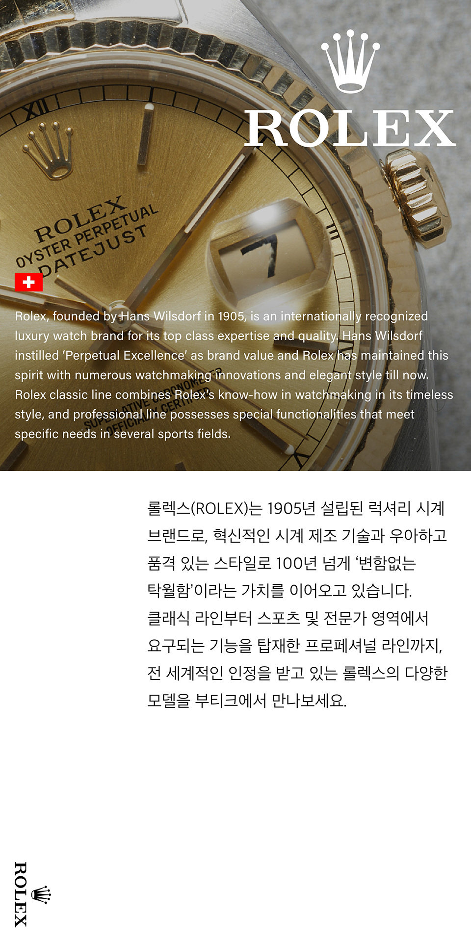 롤렉스(ROLEX)는 1905년 설립된 럭셔리 시계 브랜드로, 혁신적인 시계 제조 기술과 우아하고 품격 있는 스타일로 100년 넘게 '변함없는 탁월함'이라는 가치를 이어오고 있습니다. 클래식 라인부터 스포츠 및 전문가 영역에서 요구되는 기능을 탑재한 프로페셔널 라인까지 롤렉스의 다양한 모델들은 전 세계적으로 인정받고 있습니다.