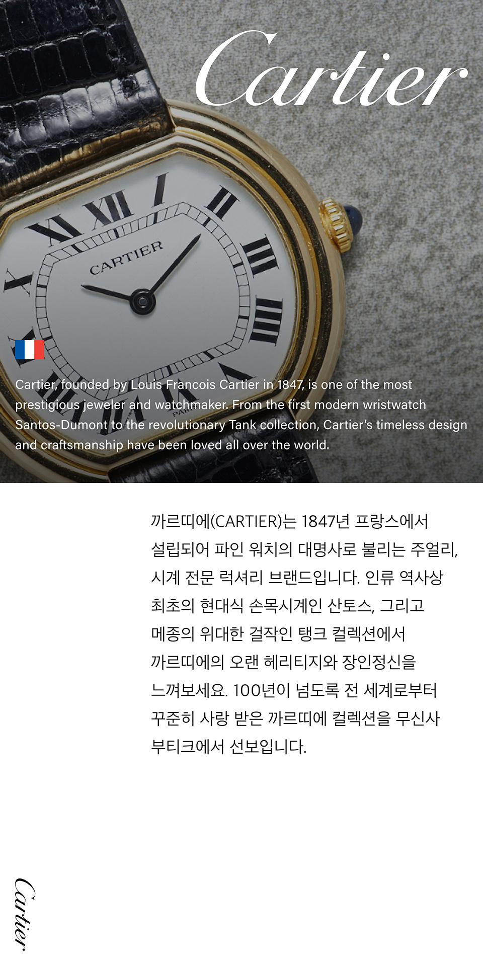 까르띠에(CARTIER)는 1847년 프랑스에서 설립되어 파인 워치의 대명사로 불리는 주얼리, 시계 전문 명품 브랜드입니다. 인류 역사상 최초의 현대식 손목시계인 산토스, 메종의 위대한 걸작인 탱크 컬렉션에서 까르띠에의 오랜 헤리티지와 장인정신을 느낄 수 있습니다.