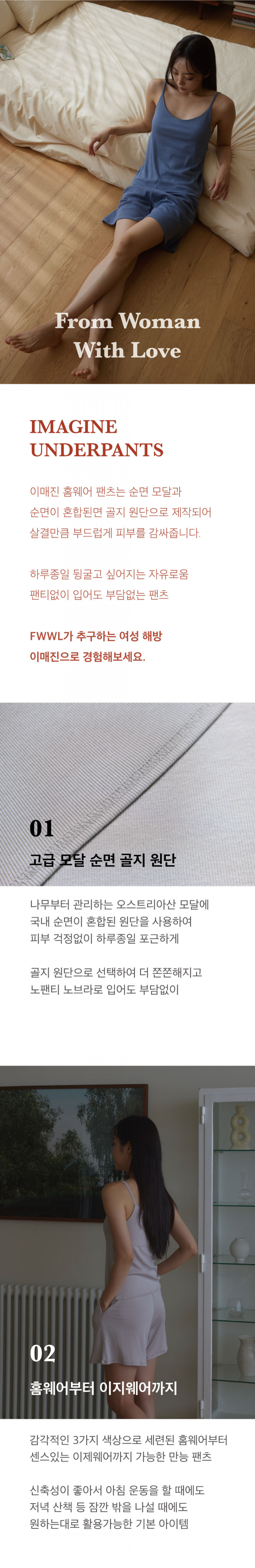 에프더블유더블유엘(FWWL)은 'From Woman With Love'의 약자로, '사랑을 담아, 여성으로부터'라는 의미를 담고 있습니다. 일상 속 건강한 하루를 위한 여성 언더웨어와 홈 웨어를 선보입니다.