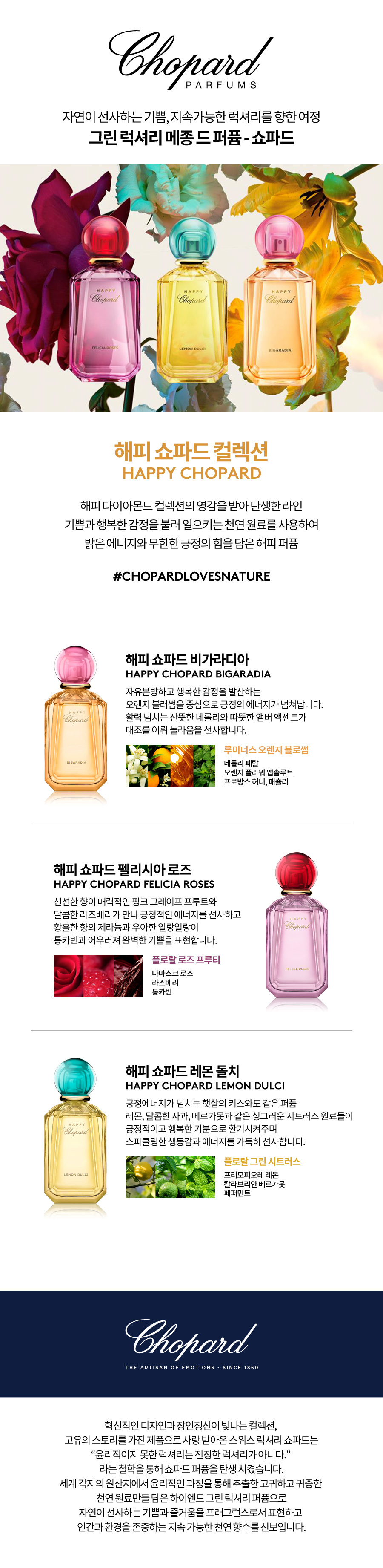 쇼파드(CHOPARD)는 160여 년 전통의 스위스 명품 주얼리 브랜드입니다. 지속 가능하고 윤리적인 럭셔리 철학을 바탕으로 한 퍼퓸 라인을 소개합니다.
