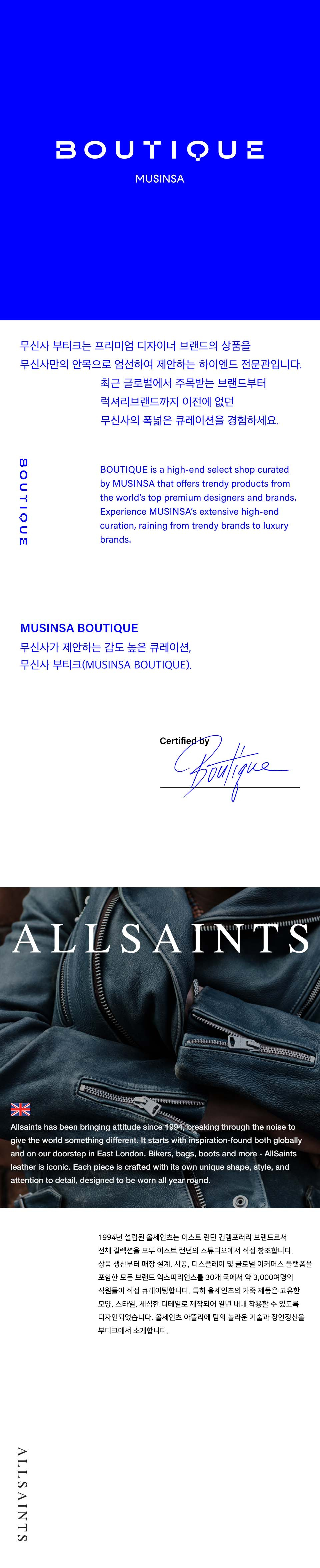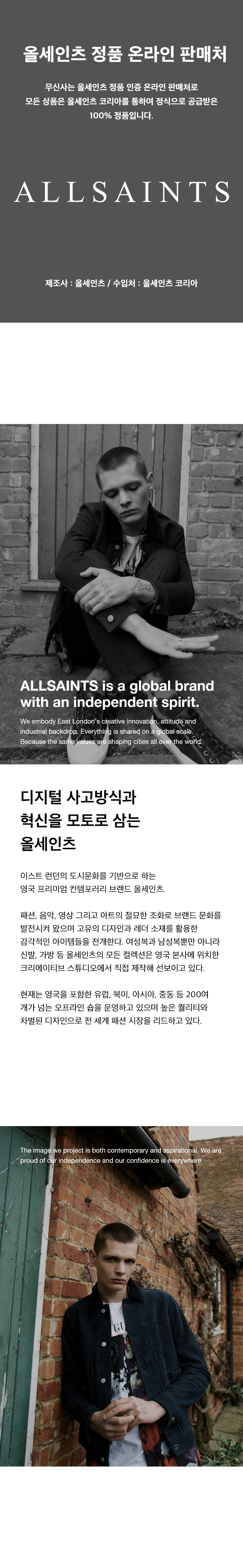 올세인츠(ALLSAINTS)는 1994년 영국 이스트 런던에서 시작한 컨템포러리 브랜드입니다. 디지털 사고방식과 혁신을 모토로, 이스트 런던의 도시 문화를 기반으로 패션과 음악, 영상, 아트와의 절묘한 조화를 통해 브랜드만의 고유한 문화 코드를 발전시켜 왔습니다.