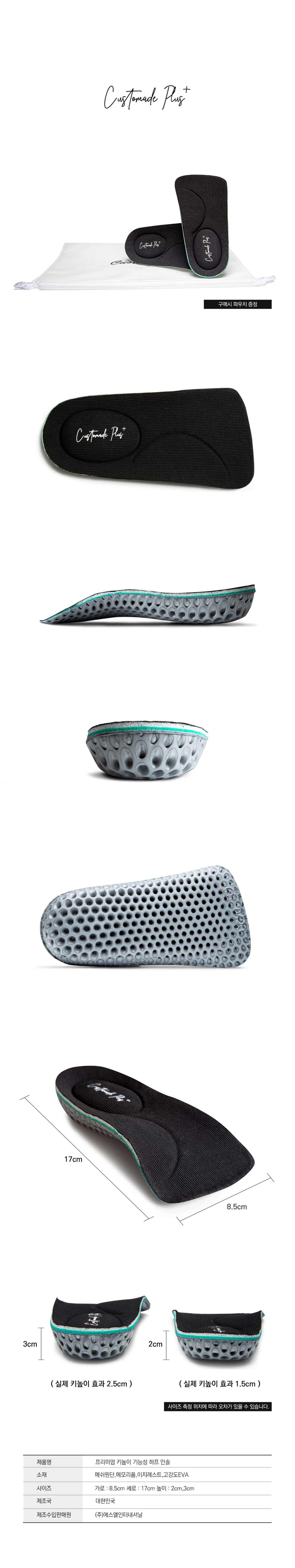 [2SET]1.5cm / 2.5cm 프리미엄 키높이 기능성 하프 인솔