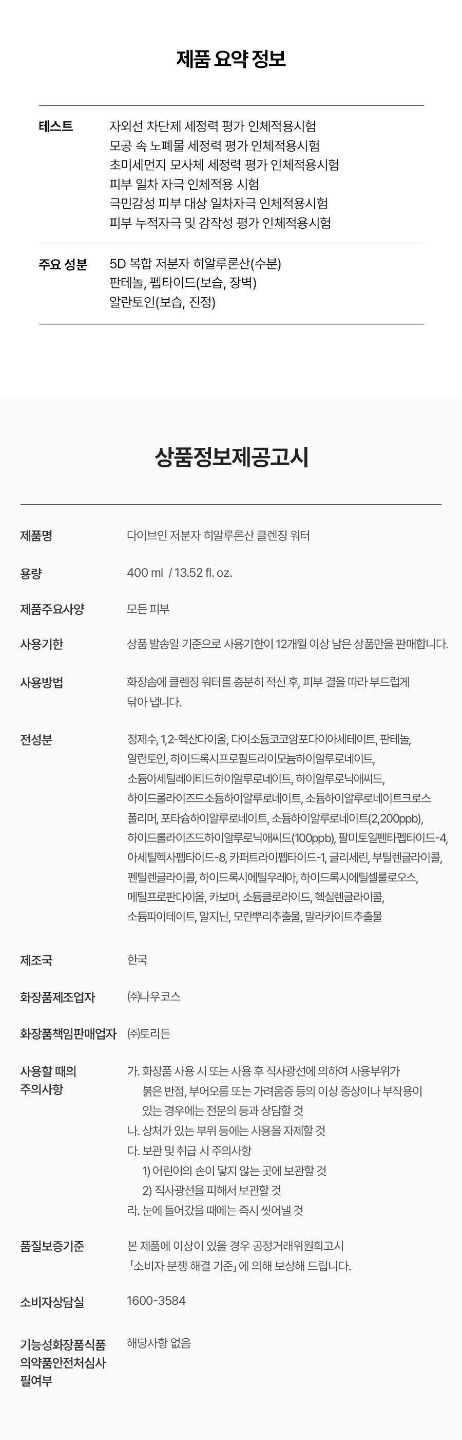 다이브인 저분자 히알루론산 클렌징 워터 센서티브 400ml