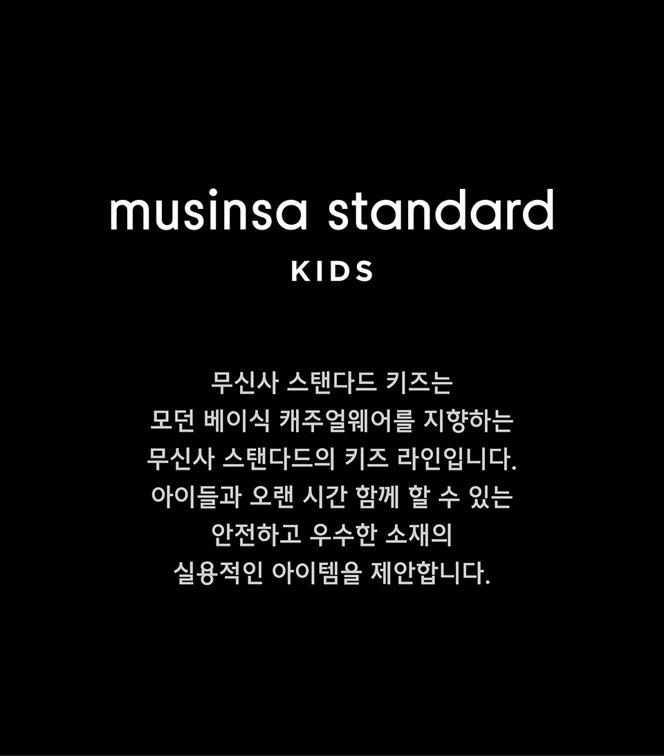 무신사 스탠다드 키즈(MUSINSA STANDARD KIDS)는 모던 베이식 캐주얼 웨어를 지향하는 무신사 스탠다드(MUSINSA STANDARD)의 키즈 라인입니다. 아이들과 오랜 시간 함께할 수 있는 안전하고 우수한 소재의 실용적인 아이템을 제안합니다.