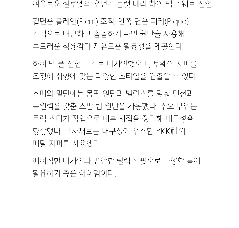 우먼즈 플랫 테리 하이넥 스웨트 집업 [블랙]