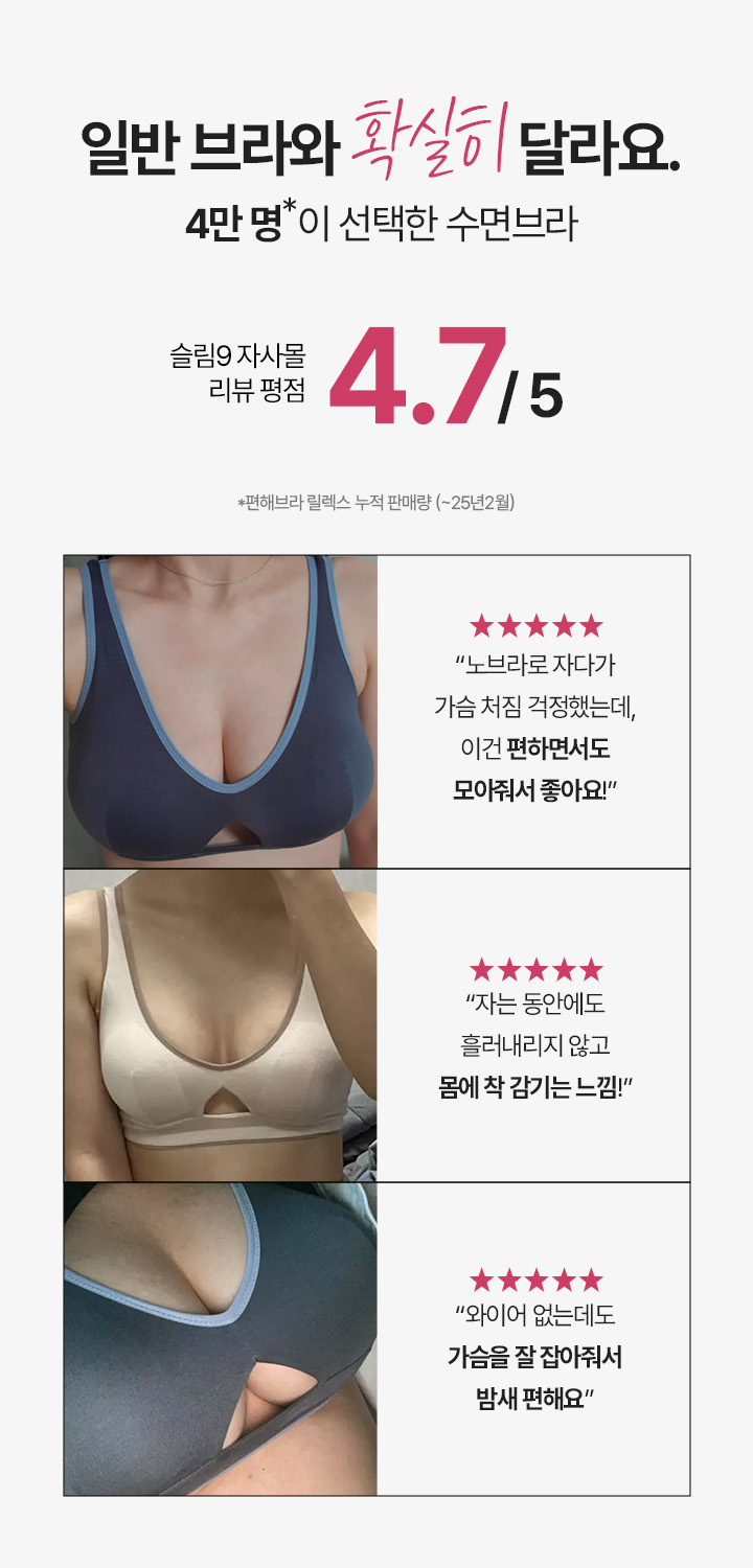 슬림나인(SLIM9)은 신체의 편안함과 슬림한 바디라인을 원하는 이들을 위해 일상 속 불편함을 함께 개선하는 브랜드입니다. 항상 고객의 니즈를 연구하고 반영하여 본질을 놓치지 않고자 합니다.