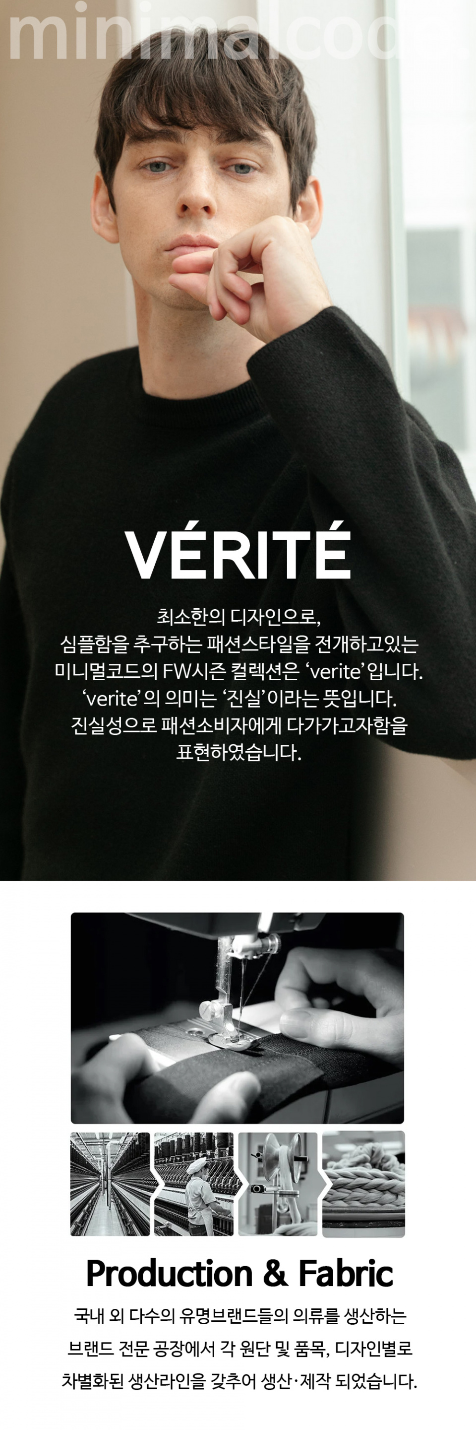 MINIMALCODE(미니멀코드)는 미니멀적인 배경을 패션에 접목시켜 세련되고 트렌디함을 추구하며, 모든 세대들을 대변하고자 독자적인 브랜드컬러와 감성으로 전개해 나가고 있는 브랜드입니다.