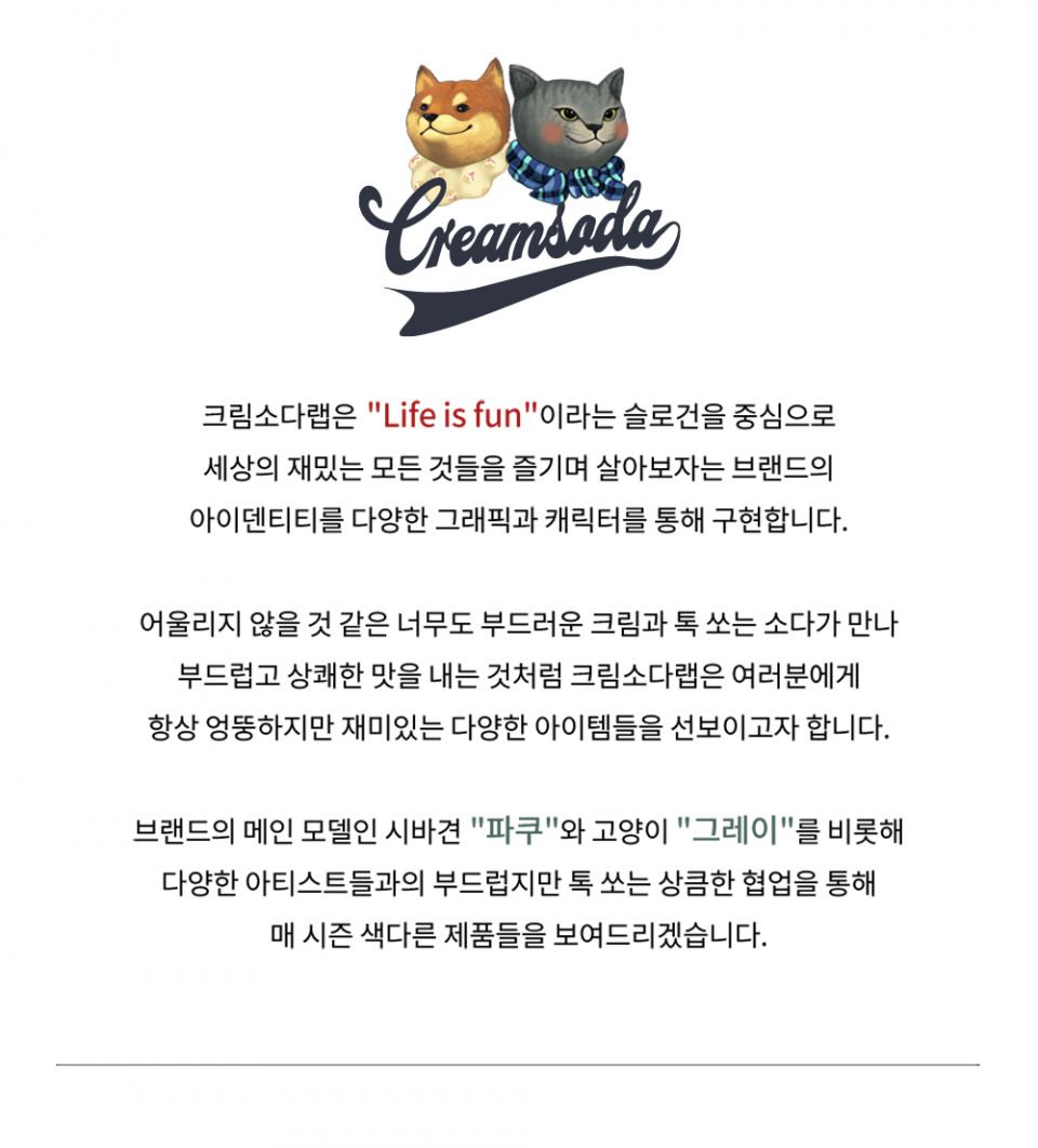 크림소다랩(CREAM SODA LAB)은 부드럽고 톡톡 튀는 팝처럼 다양한 방식으로 표현한 아트워크의 가치를 의류에 표현하는 그래픽 디자인 랩입니다.