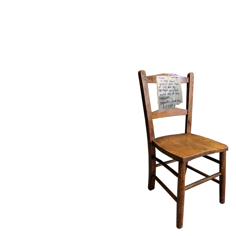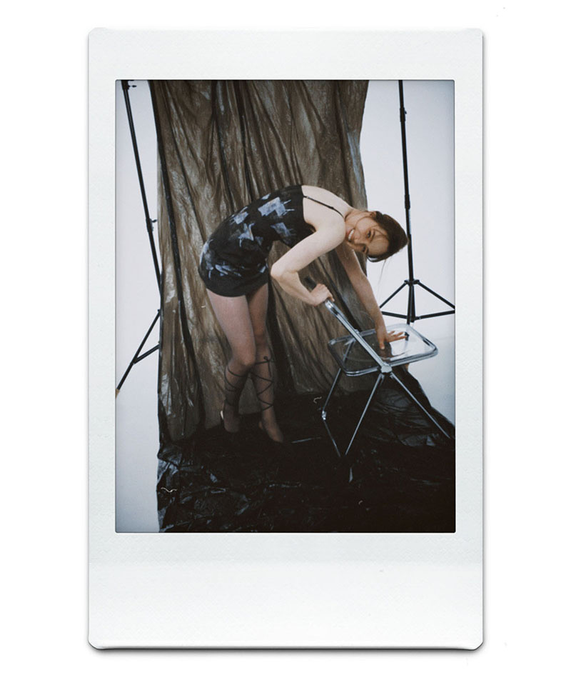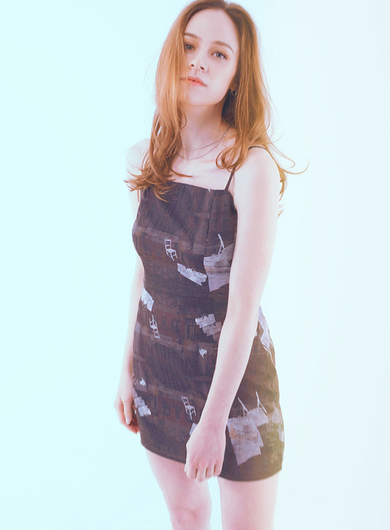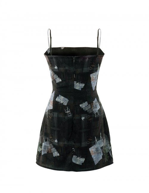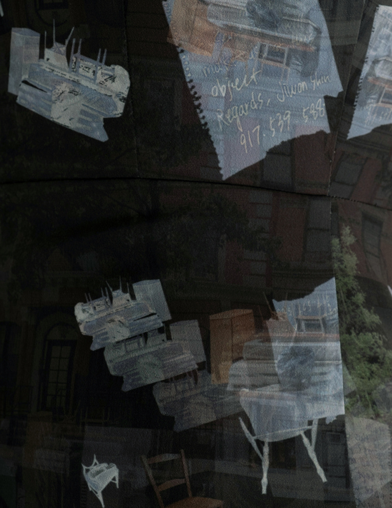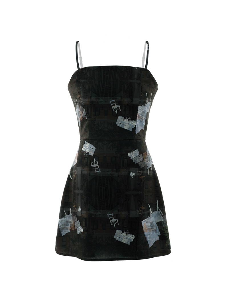 - 맨해튼의 E 13th 거리에 버려진 의자에서 영감을 받은 블루/블랙 색상의 패턴 드레스