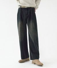 옐로우 워싱 리버스 턱 데님 팬츠 (BLACK)