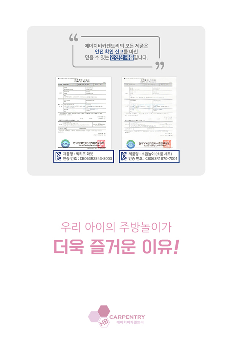 에이치비카펜트리(HB CARPENTRY)는 국내 주방 놀이 전문 유아용품 브랜드입니다. 교육적인 요소까지 고려한 최다 기능을 자랑하며, 아이가 가장 안전한 환경에서 즐길 수 있도록 엄격한 안전 규정을 준수하고 최적의 목재 두께와 무게를 선별하여 뛰어난 견고성과 내구성을 가진 제품으로 완성하였습니다. 단순 장난감이 아닌 인테리어 효과가 뛰어난 수납 가구의 역할로도 손색없는 제품으로 고객에게 다가가고 있습니다.