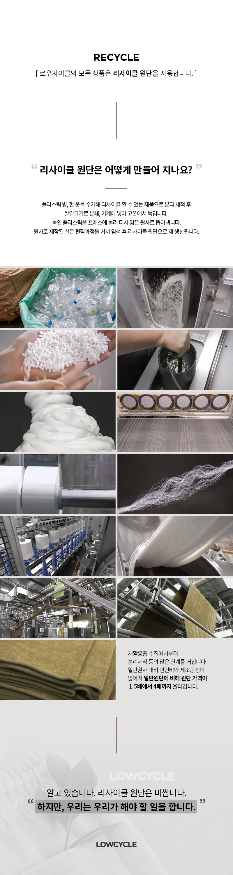 로우사이클(LOWCYCLE)은 환경을 생각하고 작은 것부터 실천하는 친환경 원 마일 웨어 브랜드입니다. 모든 제품을 리사이클 재료를 사용하여 제작합니다.