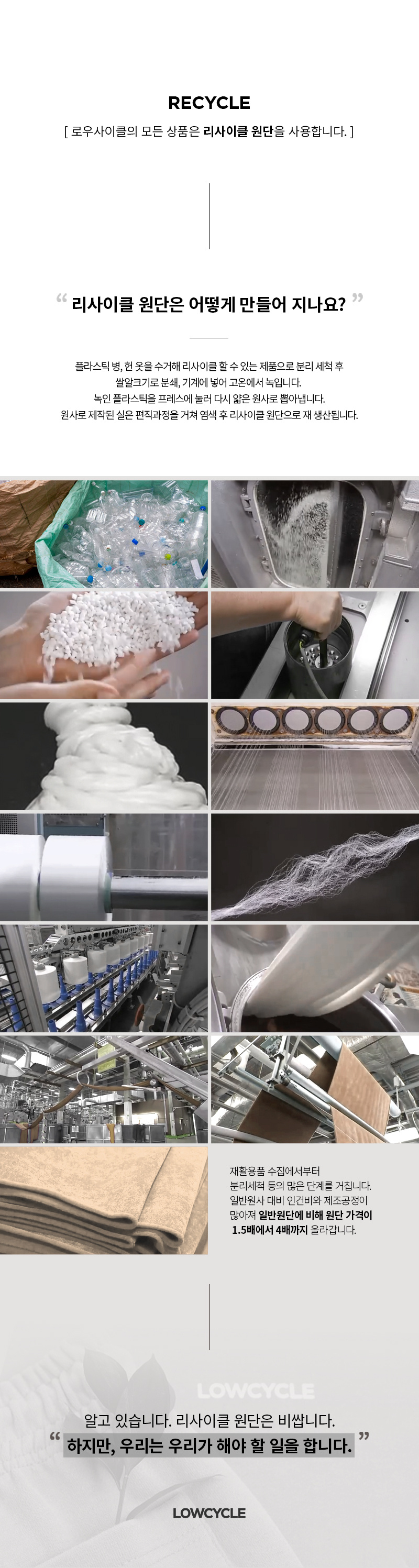 로우사이클(LOWCYCLE)은 환경을 생각하고 작은 것부터 실천하는 친환경 원 마일 웨어 브랜드입니다. 모든 제품을 리사이클 재료를 사용하여 제작합니다.