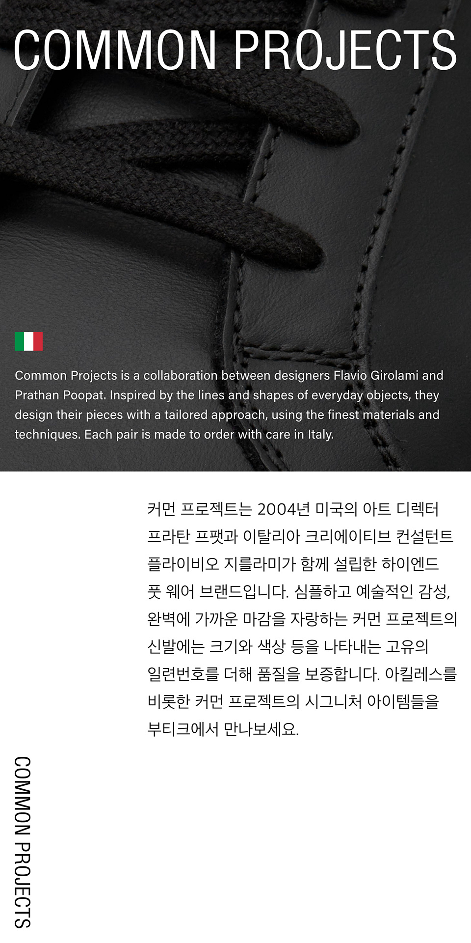 COMMON PROJECTS(커먼프로젝트)는 제품마다 고유의 일련번호가 있는 것이 특징이며 최상급의 재료와 기술로 미니멀리즘을 잘 표현했으며 럭셔리한 디자인의 하이엔드 풋 웨어 라인을 선보이는 브랜드입니다.