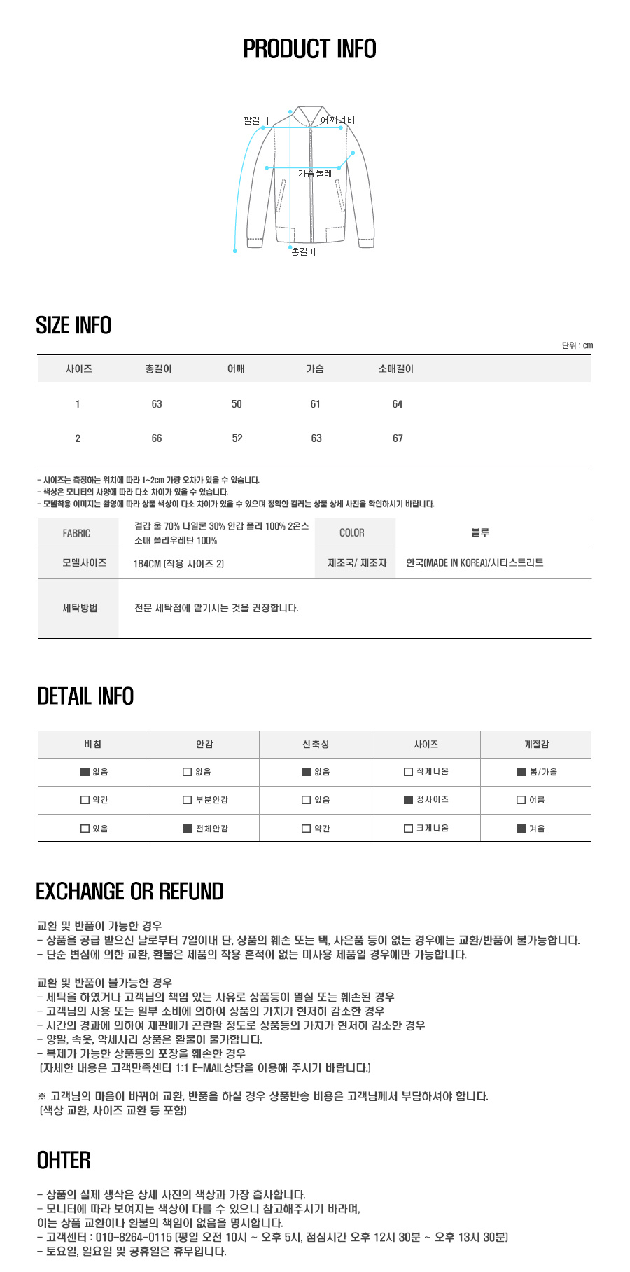 FABRIC - 겉감 WOOL 70% NYLON 30% 안감 POLYESTER 100% 2온스 소매 POLYURETHANE 100%
