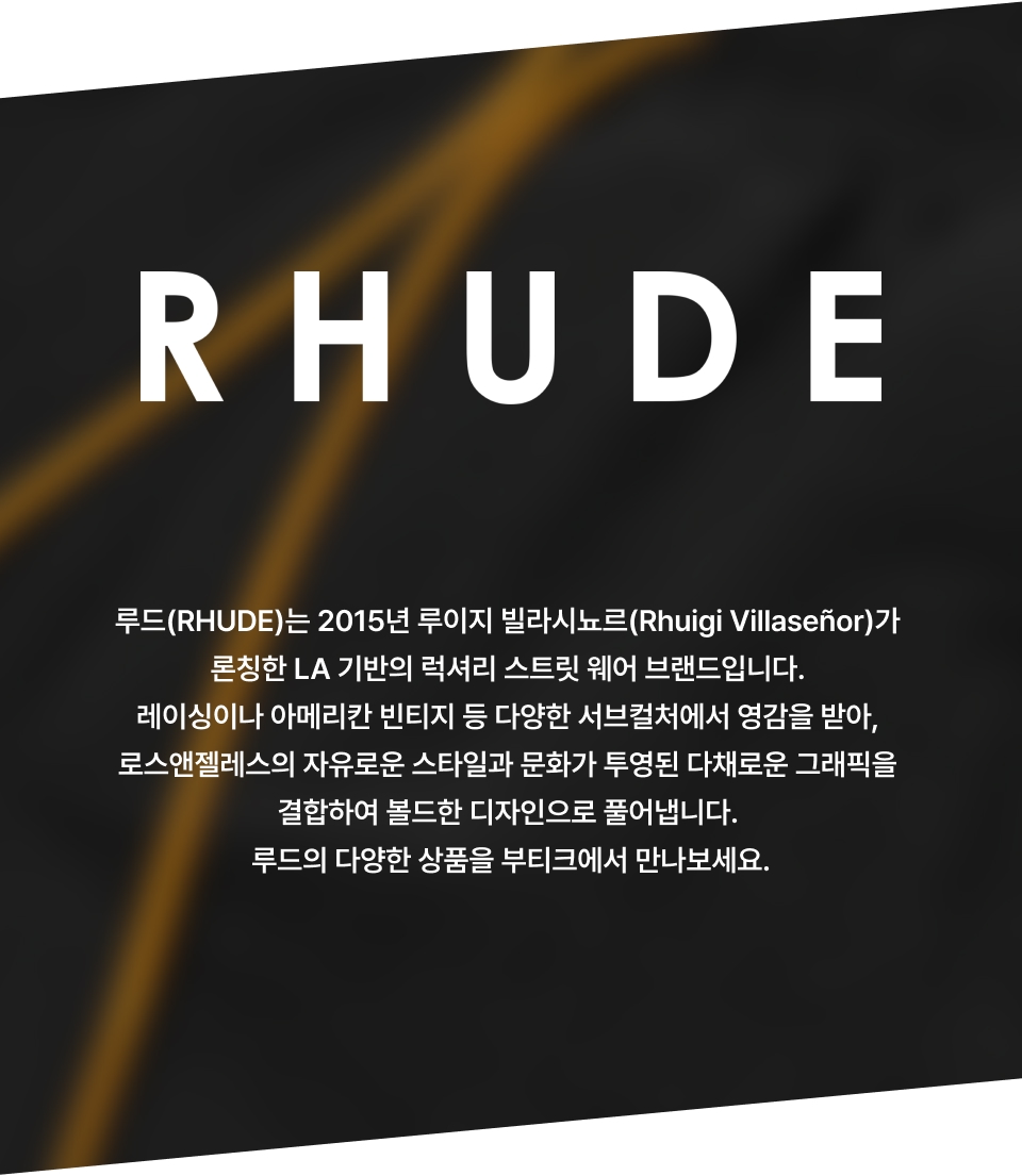 루드(RHUDE)는 2015년 루이지 빌라시뇨르(Rhuigi Villaseñor)가 론칭한 LA 기반의 럭셔리 스트릿 웨어 브랜드입니다. 레이싱이나 아메리칸 빈티지 등 다양한 서브컬처에서 영감을 받아, 로스앤젤레스의 자유로운 스타일과 문화가 투영된 다채로운 그래픽을 결합하여 볼드한 디자인으로 풀어냅니다. 루드의 다양한 상품을 부티크에서 만나보세요.