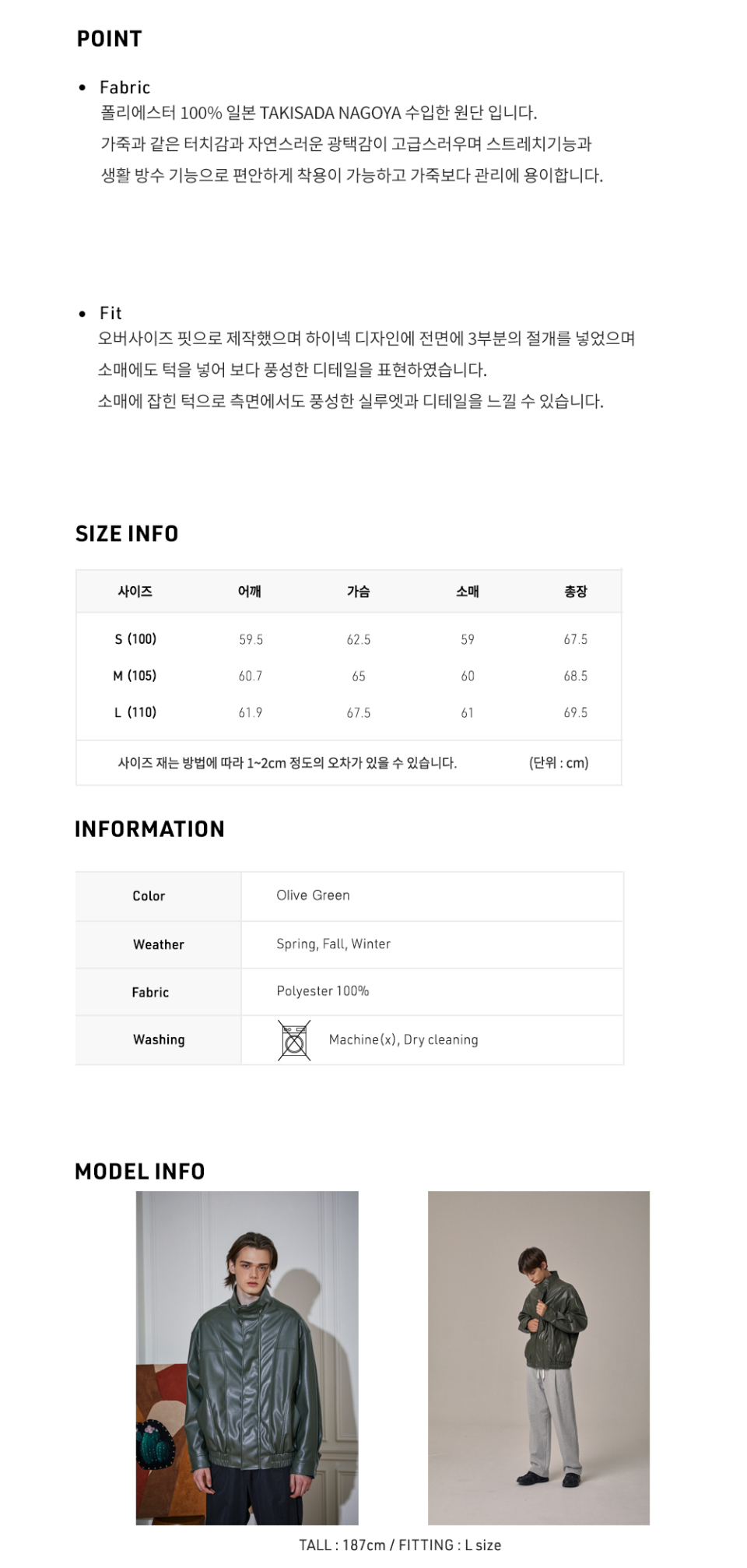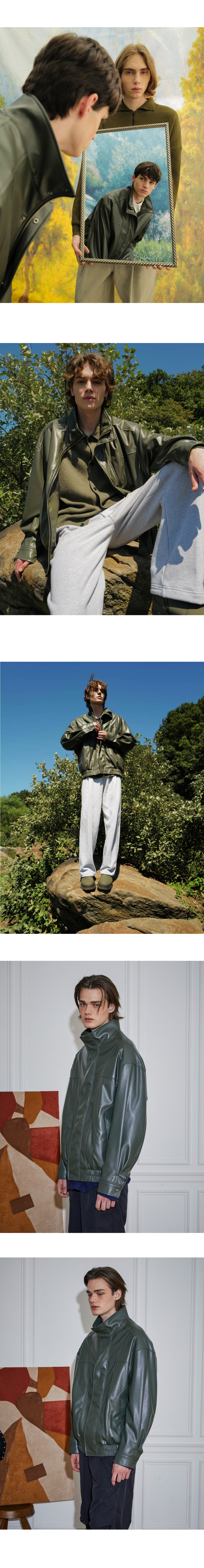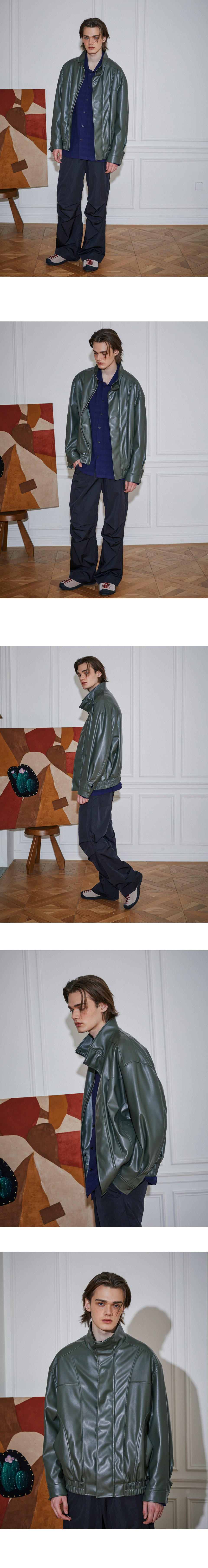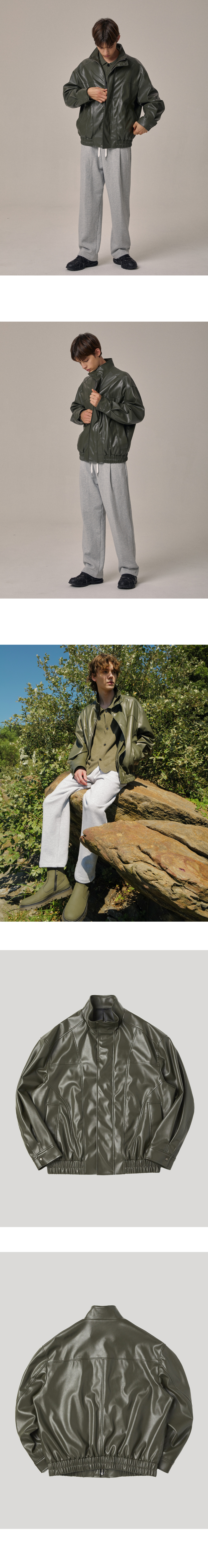 페이크 레더 오버사이즈 하이넥 블루종 올리브그린