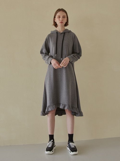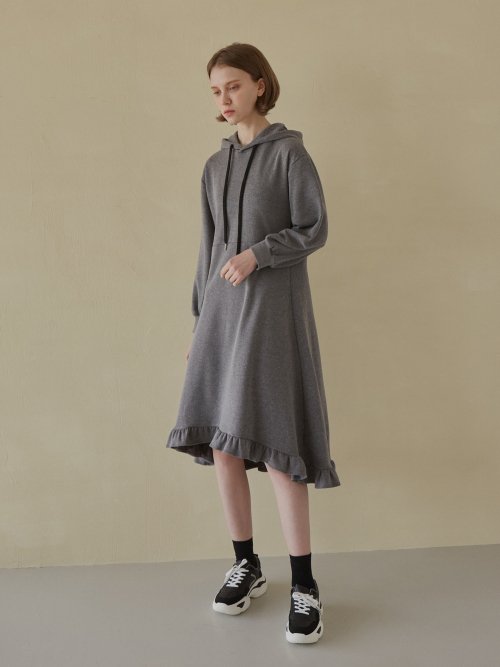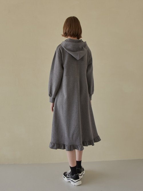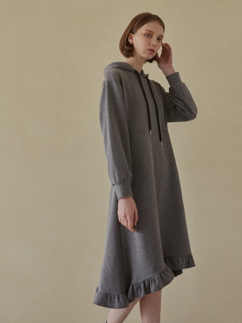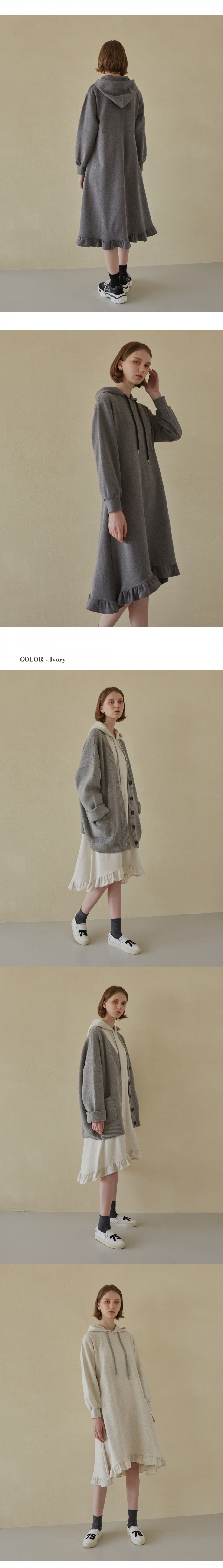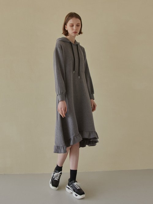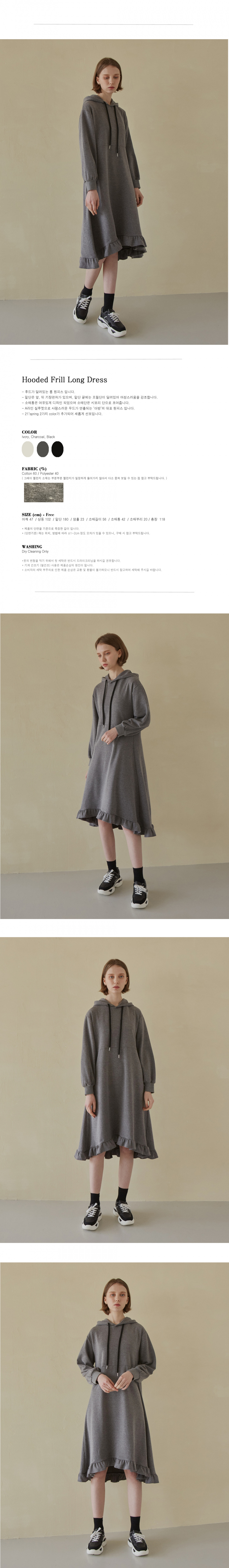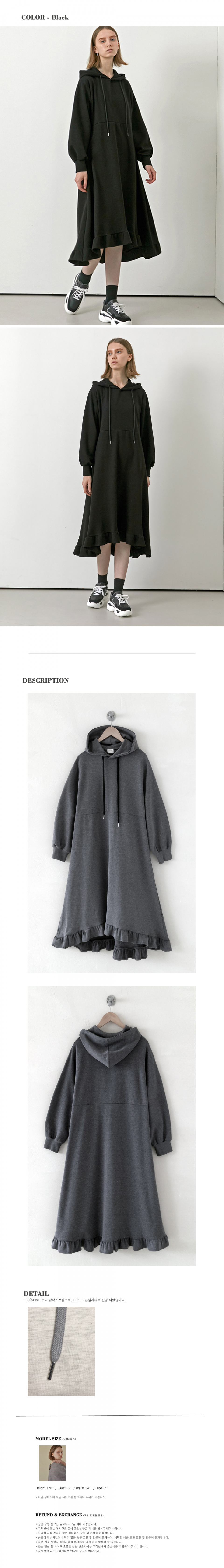 Hooded Frill Long Dress - Charcoal (기모버젼)