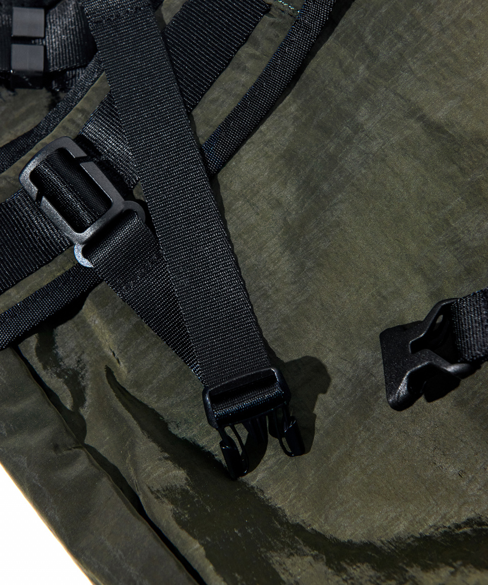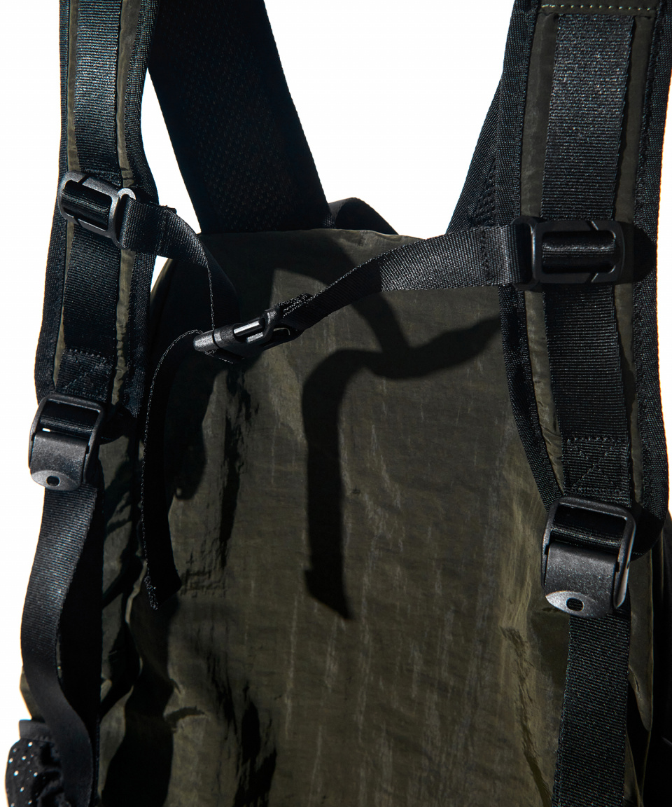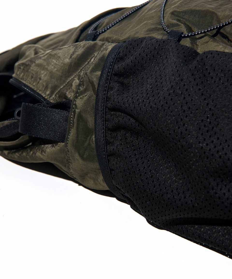 '액티비티 팩'의 메쉬 버전으로 출시된 가방입니다. 기존 제품과 다르게 양 측면 포켓과 내부 메인 포켓이 메쉬 원단으로 변경되었습니다. 각이 잡혀 있지 않고 의도적으로 흘러내리는 듯한 실루엣을 연출한 가방입니다. 등판과 포켓 부분을 제외하고 안감 및 보강재 없이 홑겹의 원단으로 제작하여 가볍고 유연한 것이 특징입니다. 가볍고 유연한 가방의 몸판 소재에 맞게 메쉬 원단 역시 부드러우며 밀도가 있는 원단을 사용했습니다. 특히 올리브 컬러는 광택 코팅 가공을 통해 은은하고 고급스러운 광택감이 느껴지며 생활 발수가 가능합니다. 이번 메쉬 버전에서는 전면부에 위치한 플리츠 분량도 조절하여 포켓을 보다 더 여유롭게 사용할 수 있도록 하였고, 잠시 벗어둔 아우터나 카라비너와 같은 악세서리 등을 걸어둘 수 있는 스트링 소재도 변경됐습니다. 일반적인 E-스트링이 아닌 재귀반사 소재의 3M 스카치 스트링을 사용하여 기능적, 디자인적으로도 퀄리티가 우수한 제품입니다. 부피가 적어 캐리어나 메인 가방에 넣어두시고 여행지에서 서브백으로 활용하시기에도 좋습니다. 무엇보다 가벼운 액티비티나 등산, 트래킹 등 활동적인 상황에서 사용하기 알맞으며 체스트 버클과 웨빙 스트랩을 통해 몸에 밀착시켜 편안한 피팅감을 느끼실 수 있습니다. 오픈 TQ파츠를 사용하여 불필요한 경우, 체스트 버클은 탈착하실 수 있습니다. 내부에도 총 3개의 이너 포켓을 배치하여 크고 작은 다양한 소지품들을 효율적으로 수납할 수 있습니다. 스트랩의 안쪽에는 에어메쉬를 배치하여 어깨에서 쉽게 미끄러지지 않고 보다 더 안정적인 쿠셔닝을 느끼실 수 있습니다.