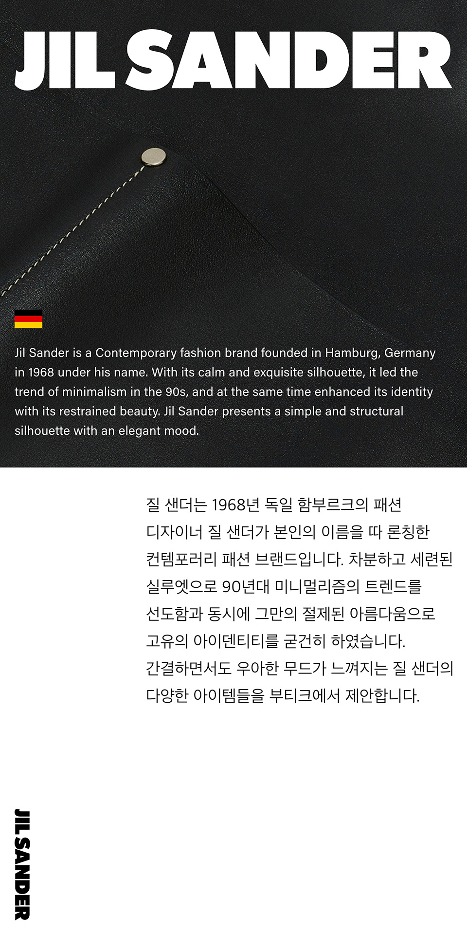 질 샌더(JIL SANDER)는 자신을 차별화하고 싶은 여성들을 위해 섬세한 색상과 원단, 형태의 디자인을 선보입니다. 심플하고 고급스러운 디자인의 미니멀리즘 미학을 선보입니다.
