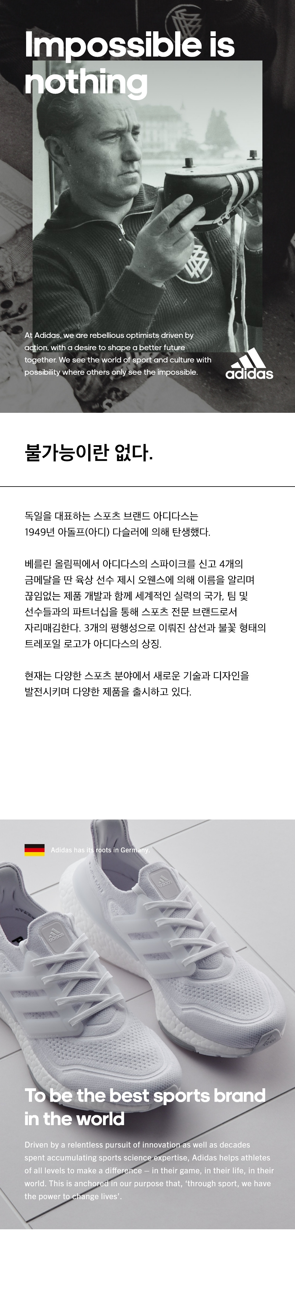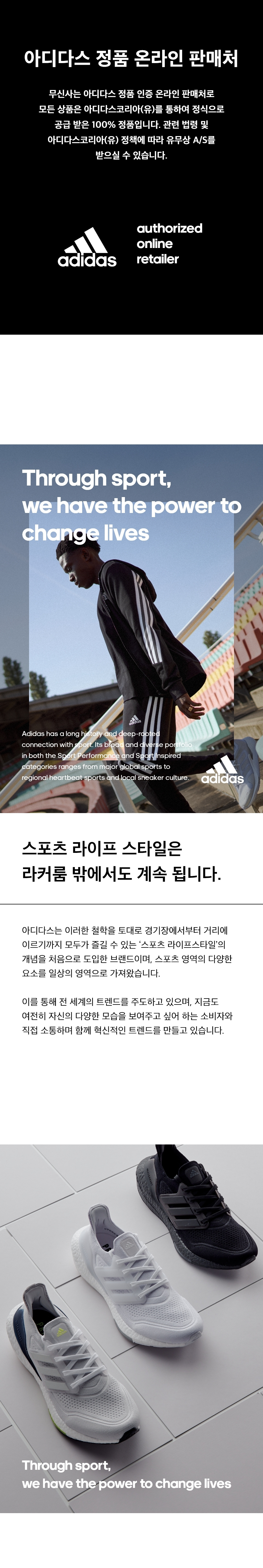 스포츠 라이프스타일은 라커룸 밖에서도 계속됩니다. 1920년부터 독일의 헤르초게나우라흐에서 스포츠 슈즈를 만들던 아디다스(ADIDAS)는 이러한 철학을 토대로 경기장에서부터 거리에 이르기까지 모두가 즐길 수 있는 '스포츠 라이프스타일'의 개념을 처음으로 도입한 브랜드입니다. 스포츠 영역의 다양한 요소를 일상의 영역으로 가져오는 아디다스는 이를 통해 전 세계의 트렌드를 주도하고 있으며, 지금도 여전히 자신의 다양한 모습을 보여주고 싶어하는 소비자와 직접 소통하며 함께 혁신적인 트렌드를 만들고 있습니다.