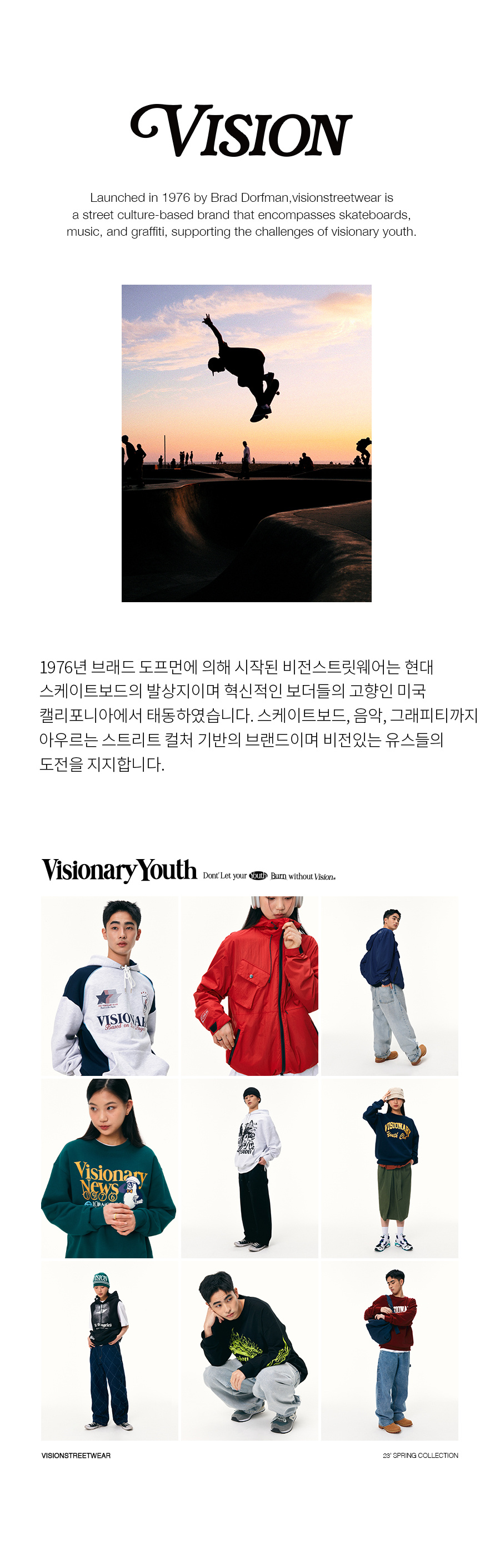 비전스트릿웨어(VISION STREETWEAR)는 1976년, 미국 LA에서 론칭한 스트릿 컬처 기반의 브랜드입니다. 스케이트보드와 음악, 그라피티 등의 서브컬처를 아우르며 비전 있는 유스들의 도전을 지지합니다.