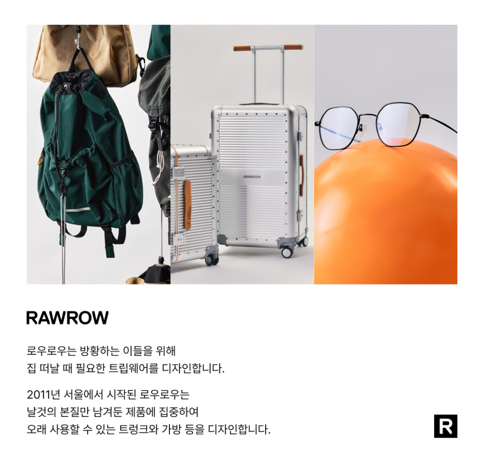 로우로우(RAWROW)는 방황하는 이들을 위해 집 떠날 때 필요한 트립웨어를 디자인하는 브랜드입니다. 날것의 본질만 남겨둔 제품에 집중하여 오래 사용할 수 있는 트렁크와 가방 등을 선보입니다.