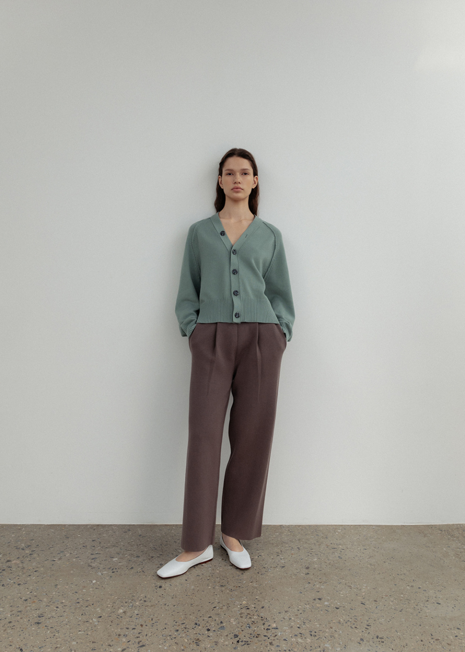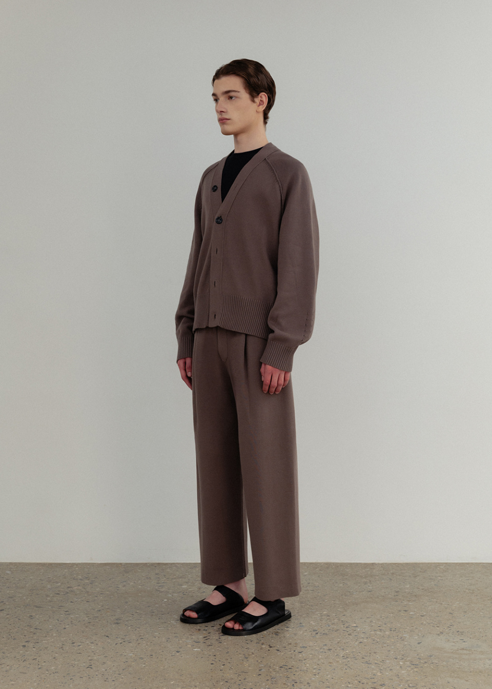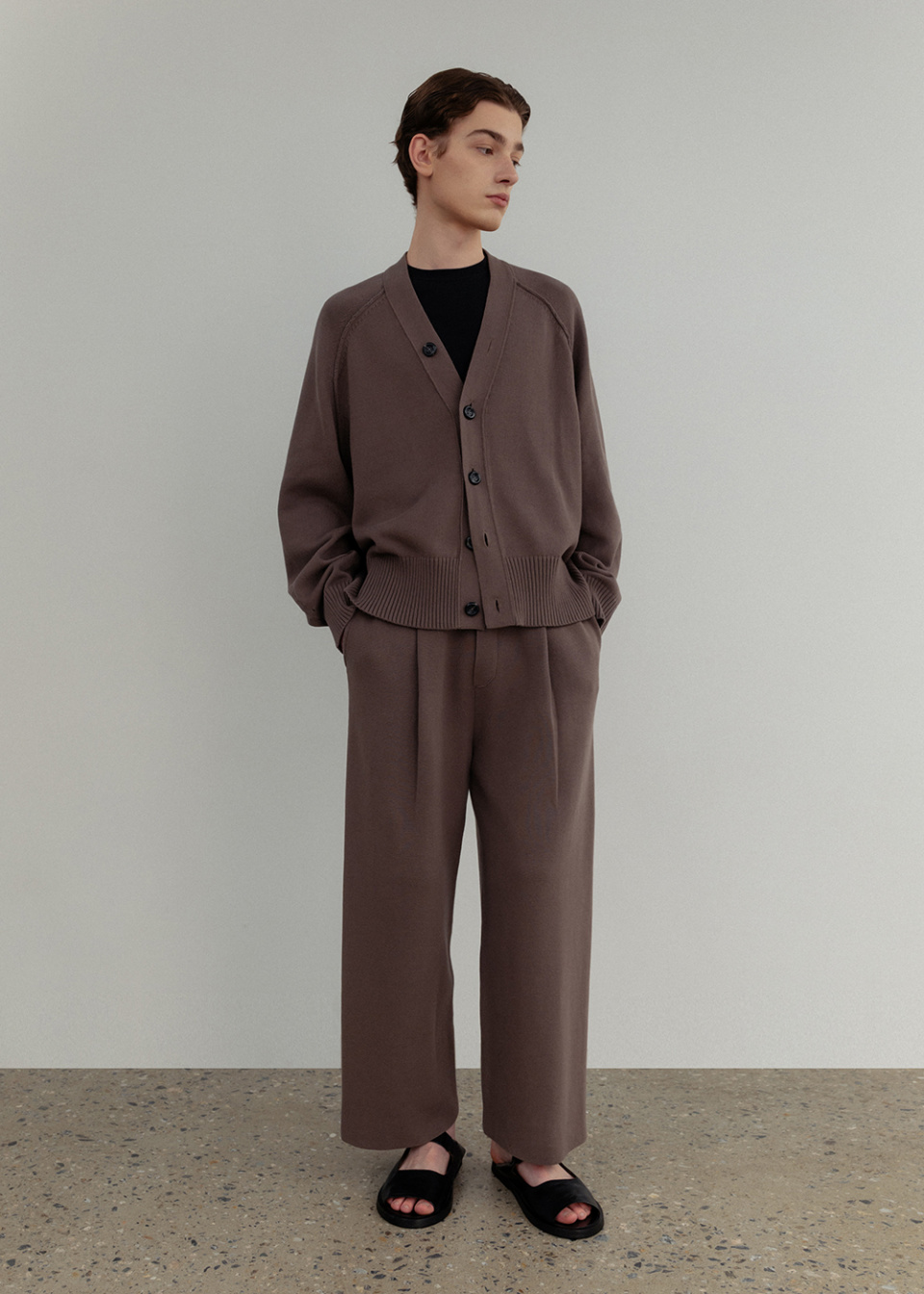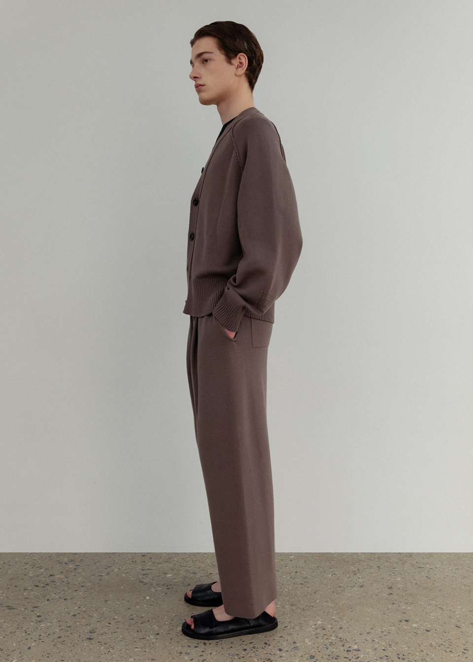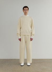 원재료가 지닌 고급스러운 광택감과 클린한 느낌은 살리면서 턱팬츠의 안정적인 형태감을 만들어 내기 위하여 탄탄한 밀라노 립 조직을 적용한 제품입니다. 니트 소재에서 느껴지는 특유의 여유롭고 고급스러운 무드와 함께 UMARMUNG만의 고난도 니트 테일러링 기법을 경험할 수 있는 유니크한 팬츠입니다.